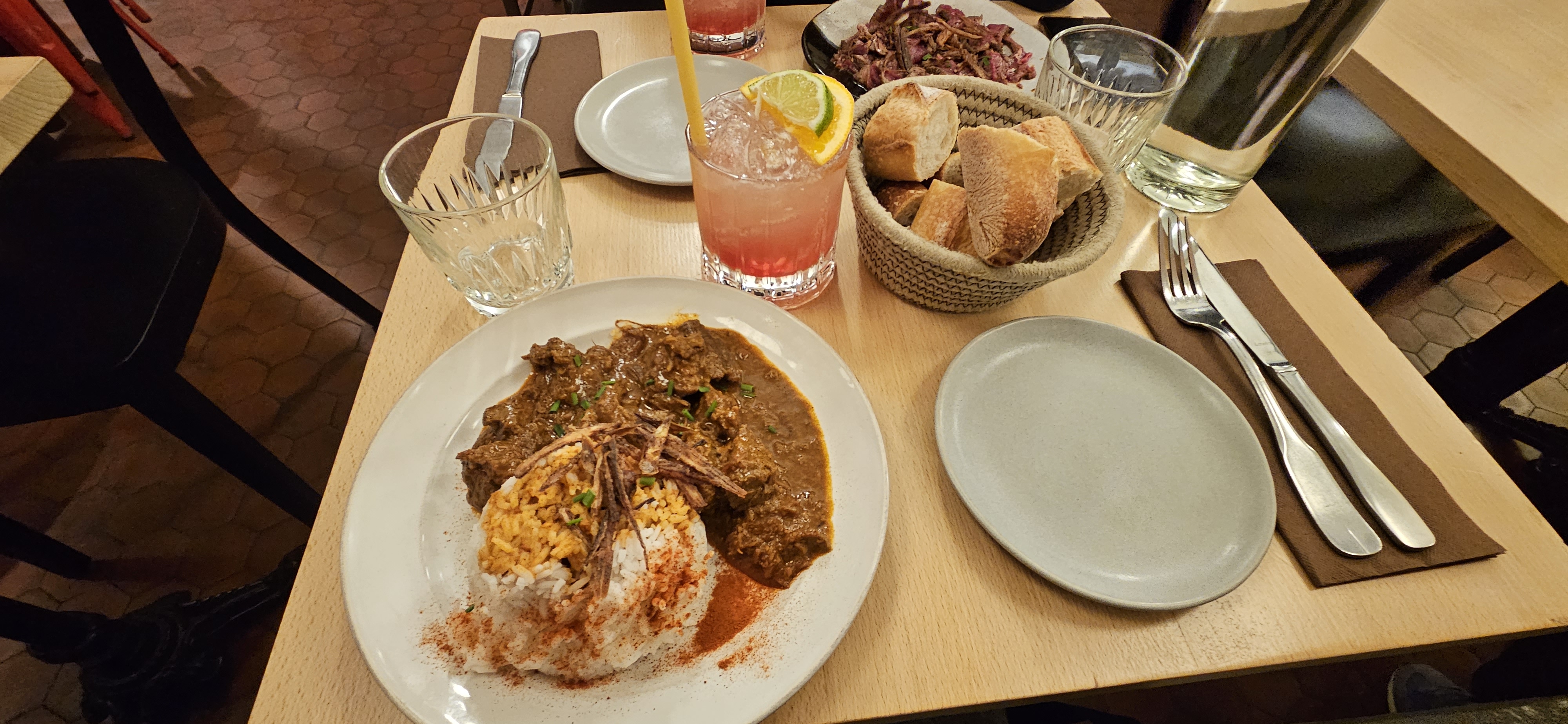 Alors autant le service Okey. Mais le Porc avec les 3/4 patates la. C’est vraiment pas terrible….désolé Le porc dur comme du béton, les 3 patates rien d’extraordinaire. Mais en revanche, 17 euros ! Et le mojito à 12 euros, qui manque de sirop de Cannes, de citron et de menthe…. Heureusement le pain était bon, et la serveuse gentille. Mais c’est effectivement ni plus ni moins qu’un bar et non un resto
