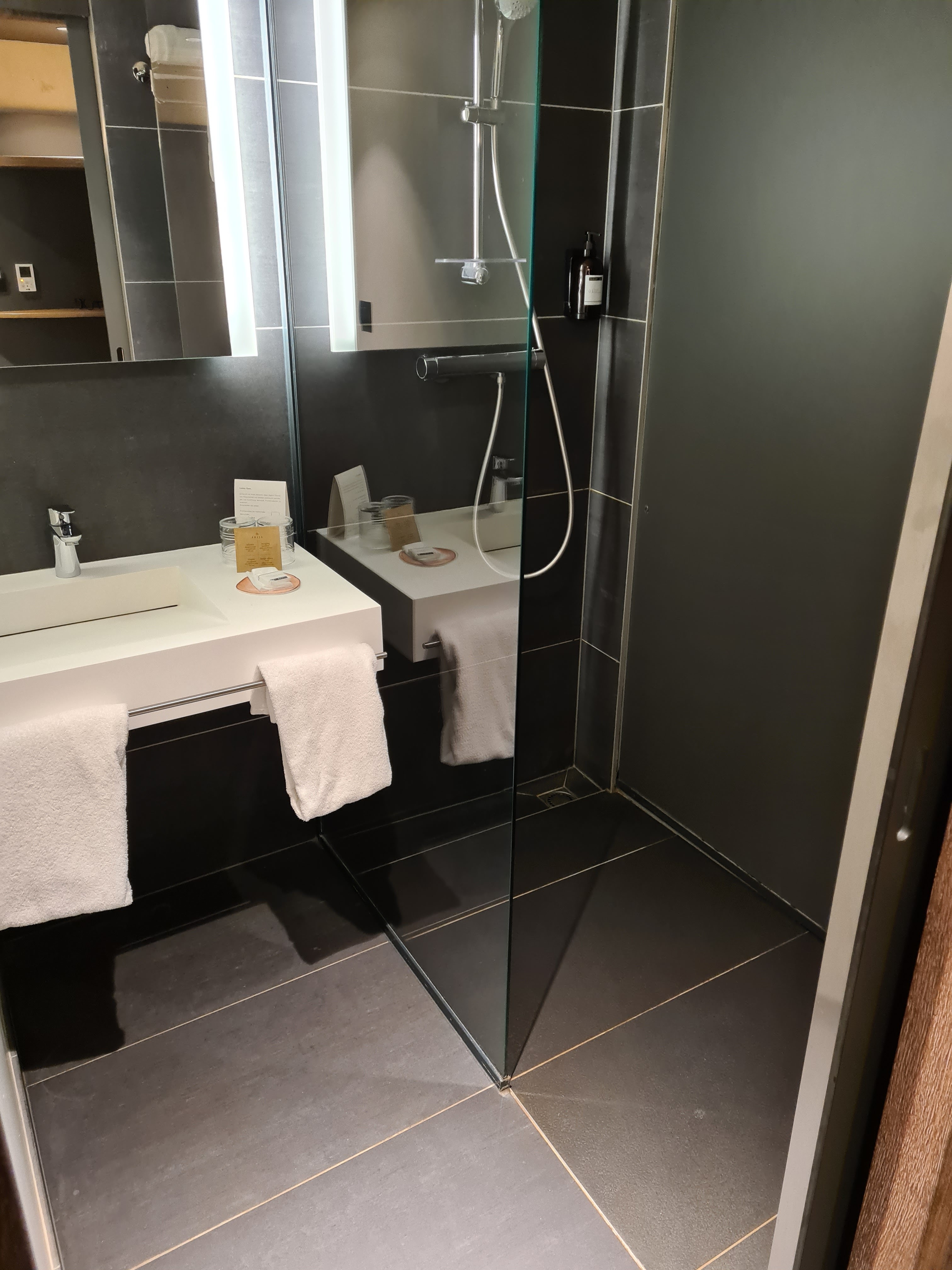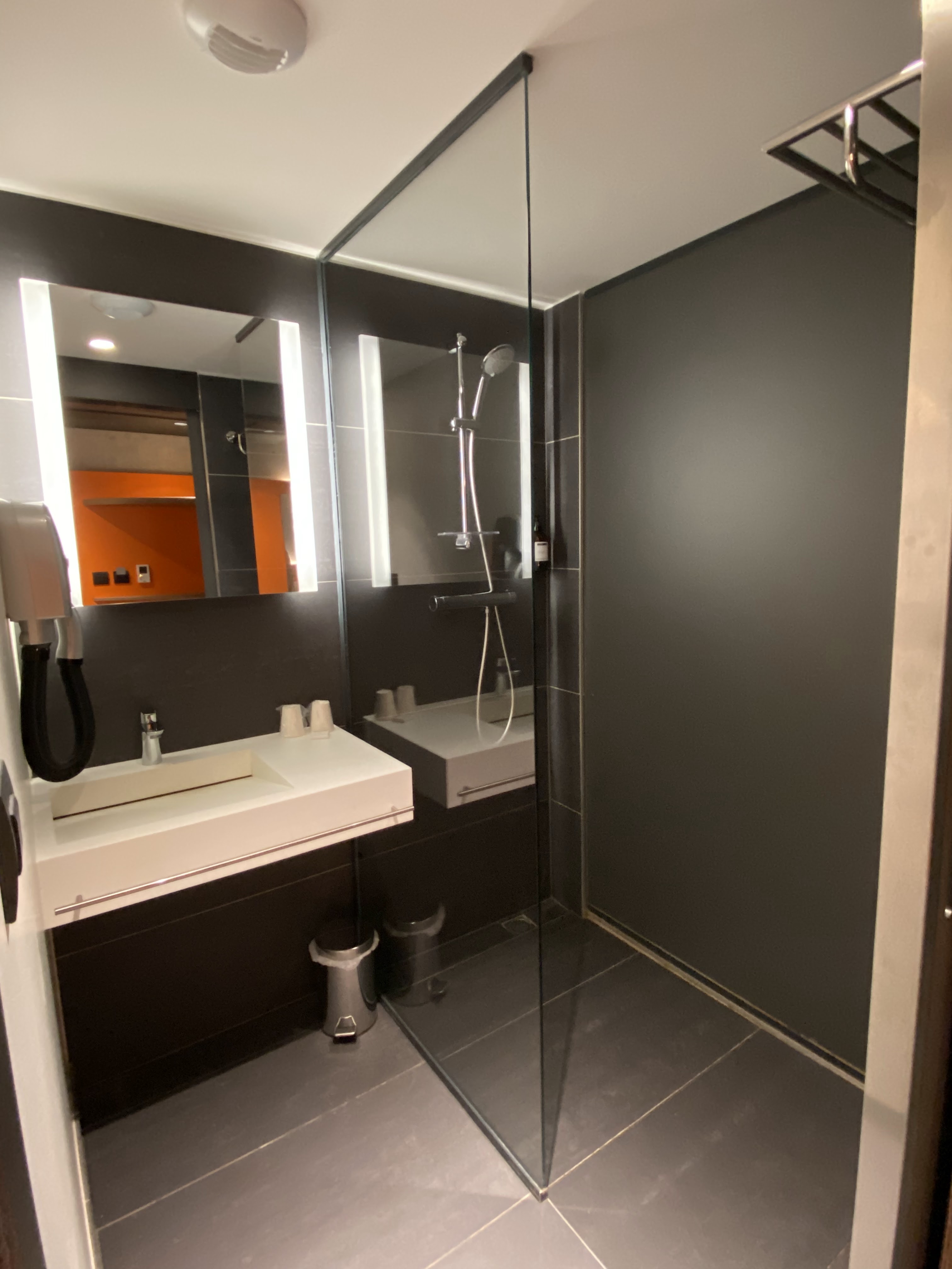 Bon hôtel d'étape sur le retour des vacances mais peut-être un peu cher pour la qualité. Chambre très grande mais salle de bain minuscule où on ne peut rien poser. Douche agréable avec une bonne pression. Grand lit confortable mais les tables de nuit sont beaucoup trop éloignées ce n'est pas pratique. Idée d'écologie bien mais pas assez poussée (pa recyclé mais gobelets au lieu des tasses, bouteilles d'eau en plastique offertes alors que ce n'est pas nécessaire...). Petit déjeuner pas mal mais plutôt industriel et beaucoup de portions individuelles emballées encore une fois peu cohérent avec l'esprit écologique presenté