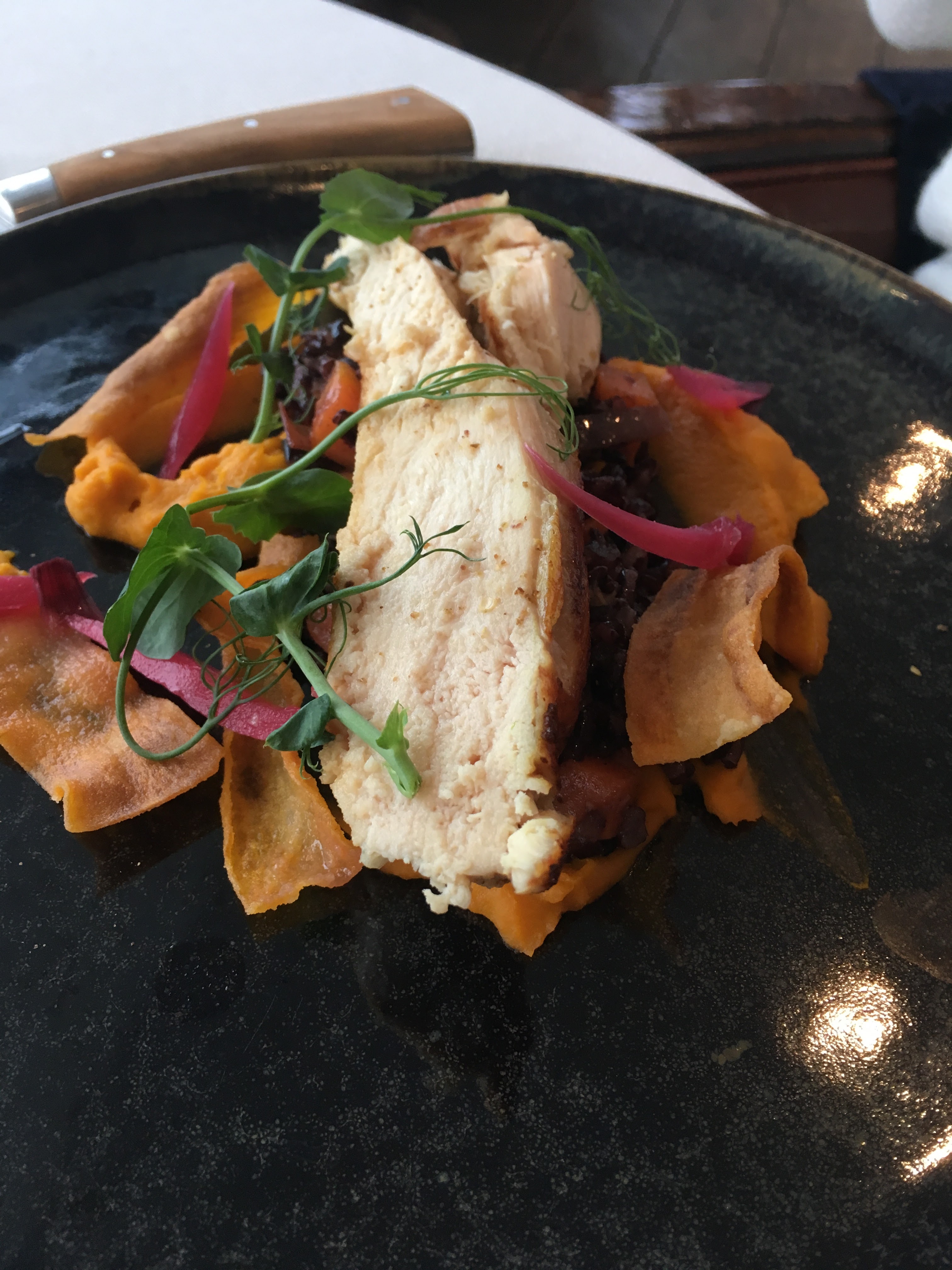 Ce fut dans l’ensemble une très belle expérience au club. J'ai visité un mercredi et ce qui semblait être une nuit un peu creuse pour eux. La cuisine a démarré assez lentement et cela a également affecté la façade de la maison, certaines assiettes n'arrivant pas et les serveuses ne communiquant pas très bien avec les invités. Ce qui lui fait vraiment perdre une étoile supplémentaire, c'est que certaines assiettes étaient un peu apprivoisées dans la plupart des cas et auraient eu besoin de saveurs plus fortes. Mais dans l’ensemble, c’était une bonne nourriture et un environnement très agréable. Je le recommanderais, mais il y a certainement d'autres restaurants que je placerais à côté.