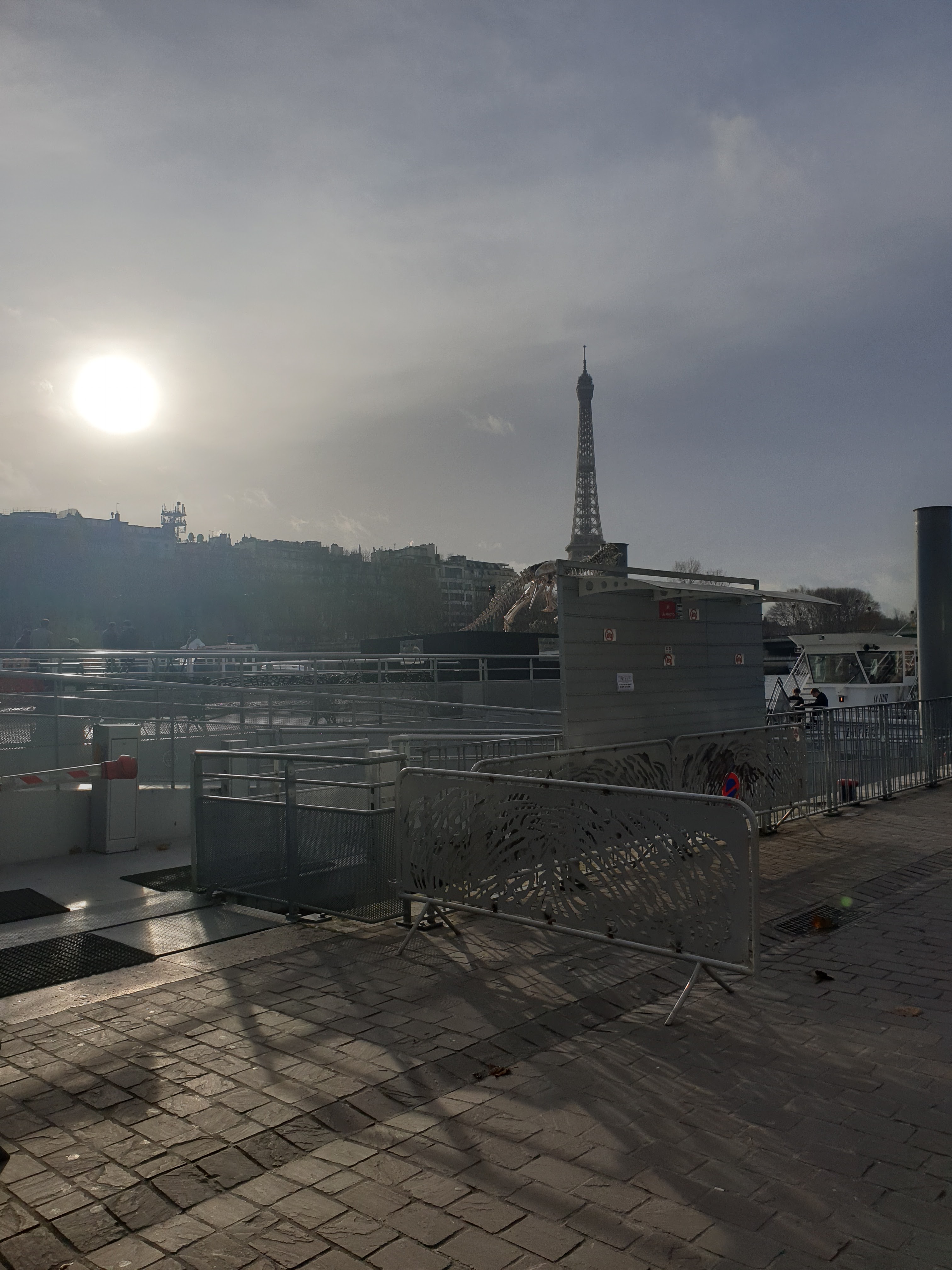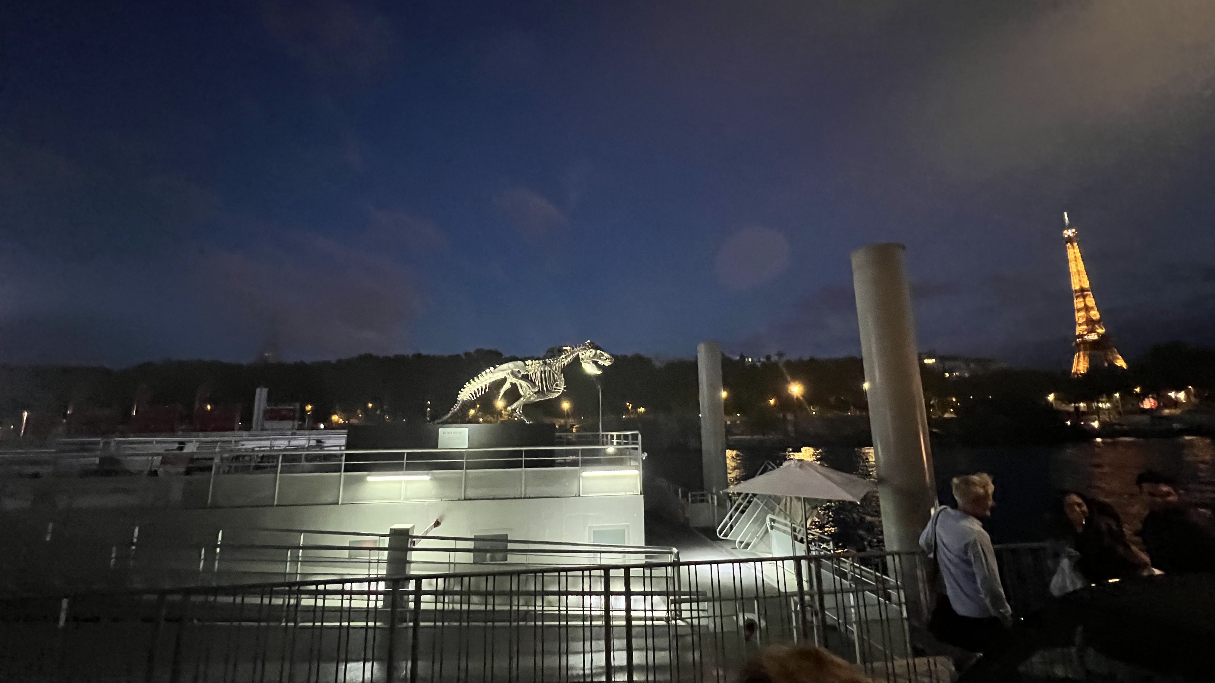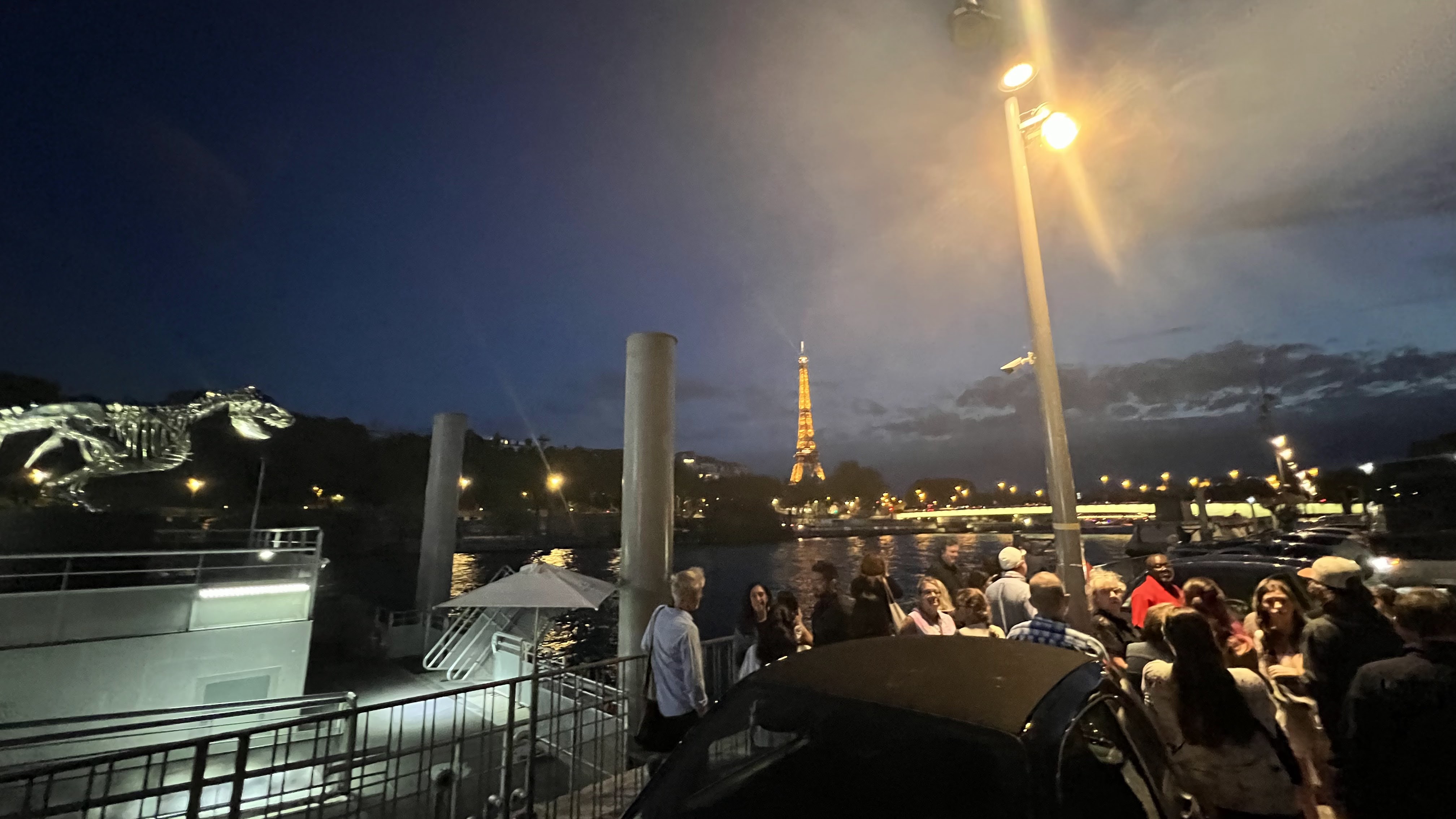 Cadre superbe face à la tour Eiffel sur le rooftop d une péniche. Le decor est planté. La musique et l ambiance sont très sympas, il y en a pour tous les gouts. Le service gentil à souhait - merci à Pierre - et rapide, et surtout ils prennent le temps de parler, de communiquer et c est la base du metier, faudrait il le rappeler à d autres endroits. Enfin merci au service de sécurité. Alors oui on est venu avec plus de monde que prévu, oui certains ont été refusés au début ... Cependant ils sont à l écoute, il a fallu faire preuve de patience et on a trouvé des gens humains. Trente minutes après et tous été rentrés. Hichem et Omar ont géré à souhait sans pour autant faire preuve de favoritisme et ca c est cool.