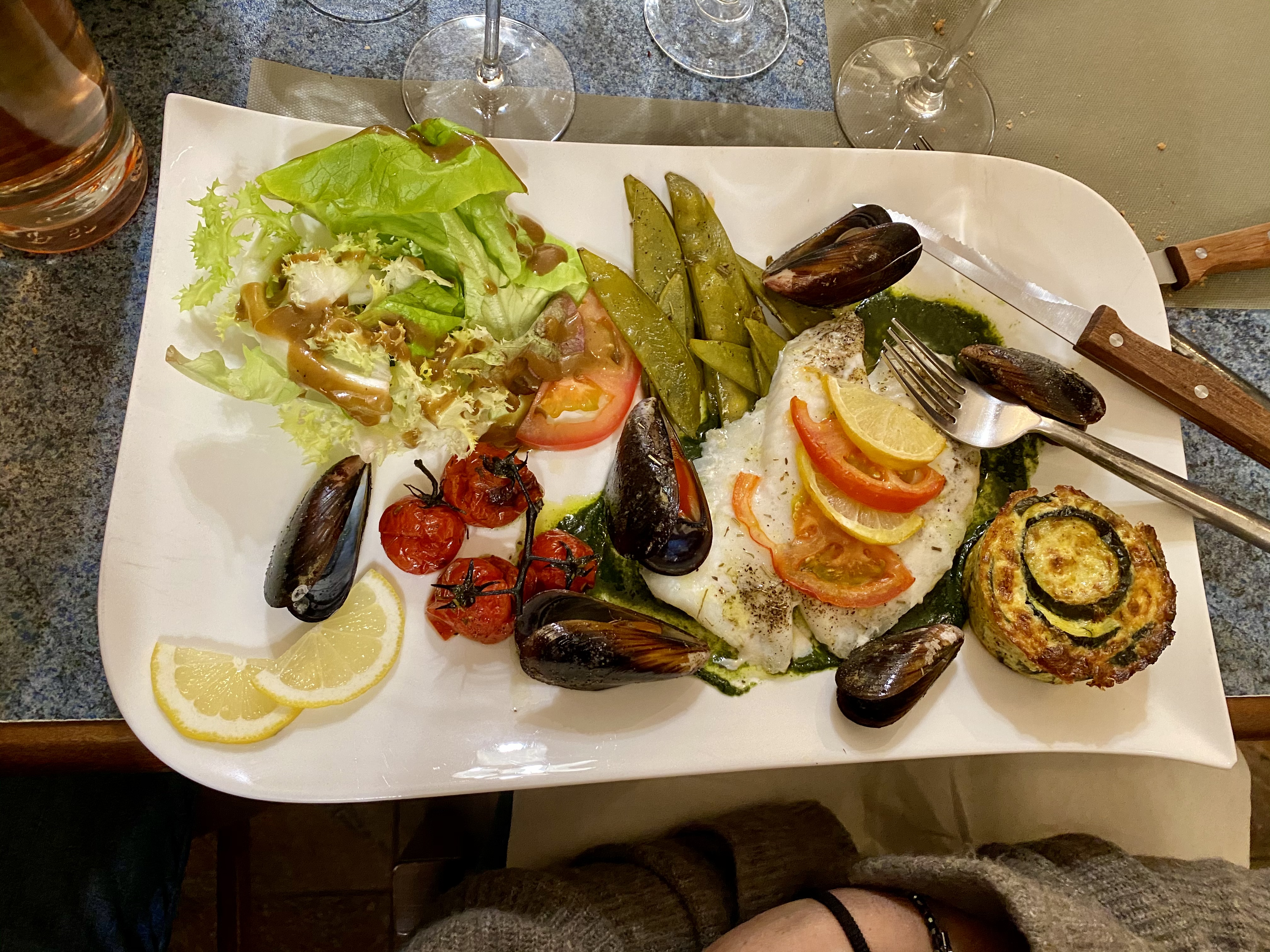 Salade , aumônière chèvre miel , légumes anti pasti, fromage, assaisonnement … tout était délicieux dans ce petit restaurant en plein cœur du village ; bien accueillis malgré 2 salles bondées ! Merci pour ce bon accueil