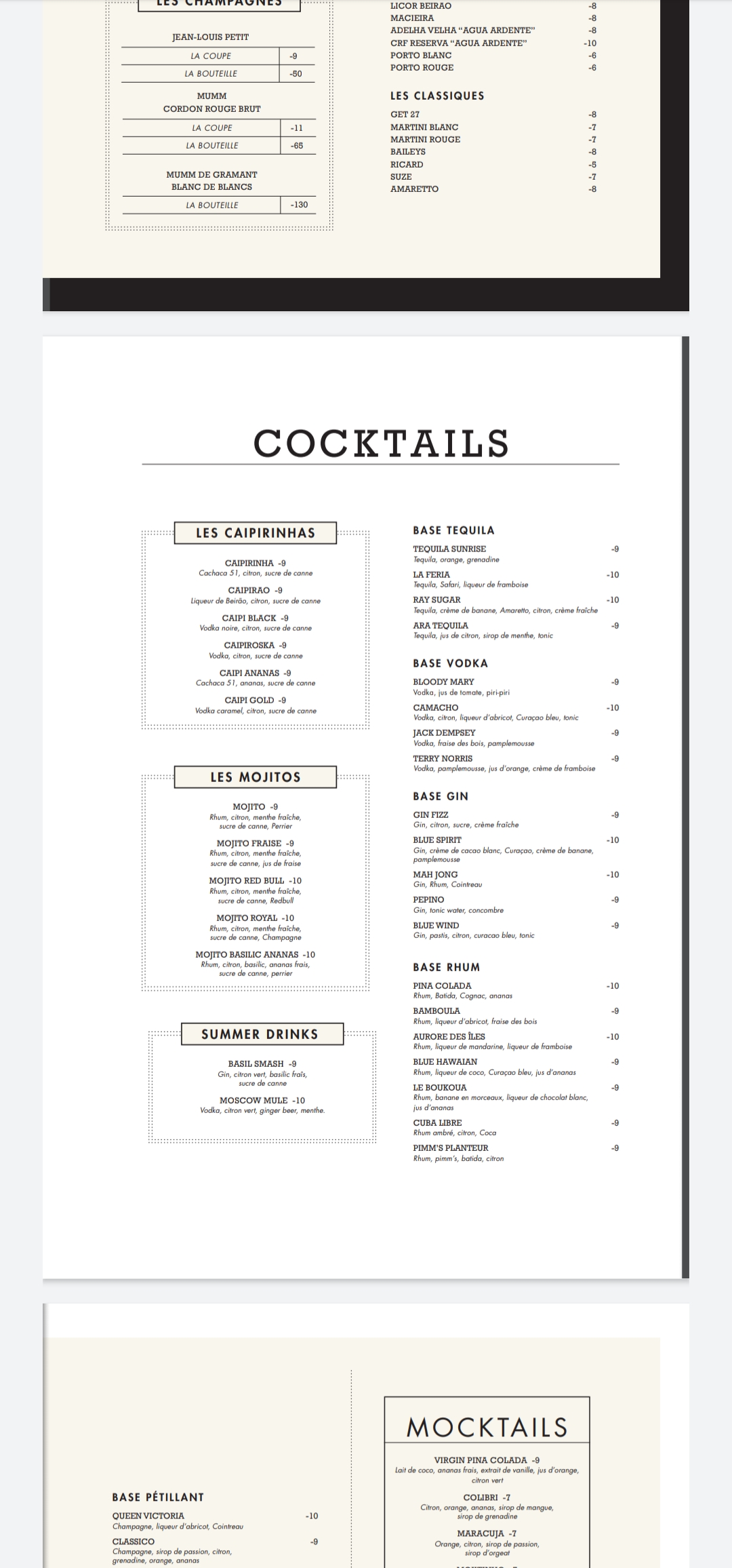 Changement de carte il n y a plus les supers cocktails d avant quel dommage et assiette portugaise moins fournies quel dommage car le cadre est incroyable. La musique géniale et le personnel au top...