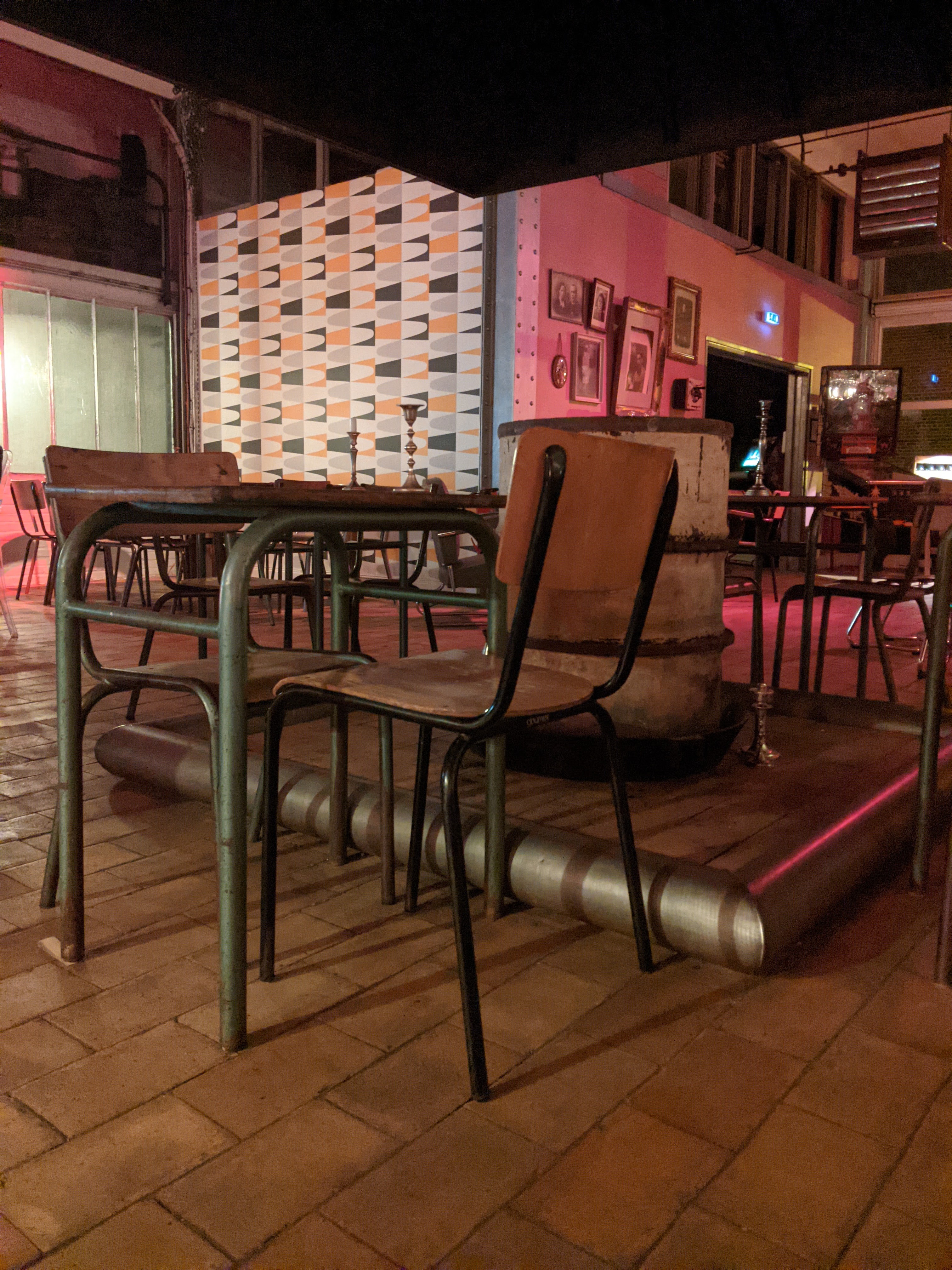 Lieu atypique mais avec beaucoup d espace et une ambiance vintage. La nourriture (tapas portugaises) était vraiment bonne. Il faut réserver le week-end...