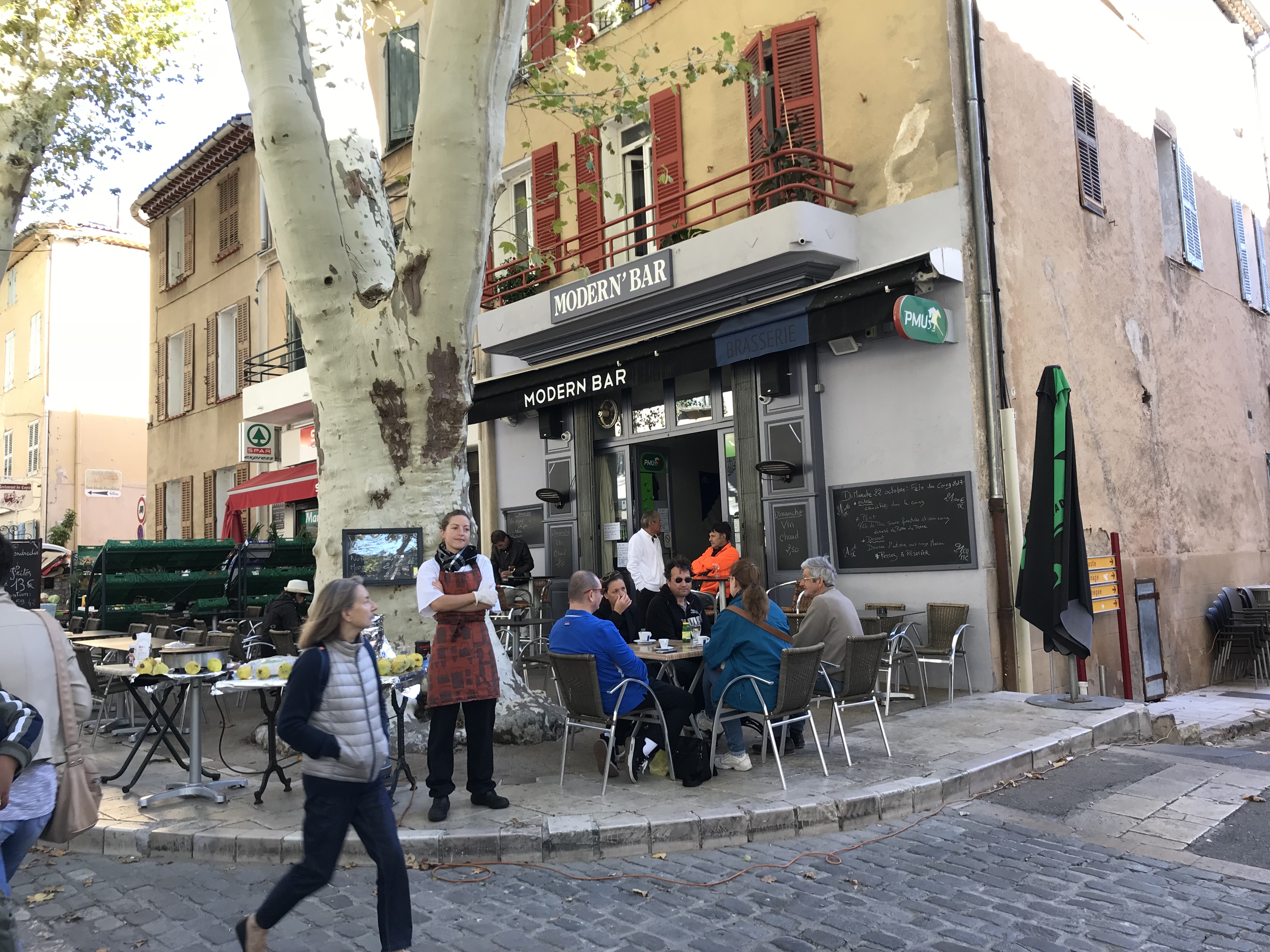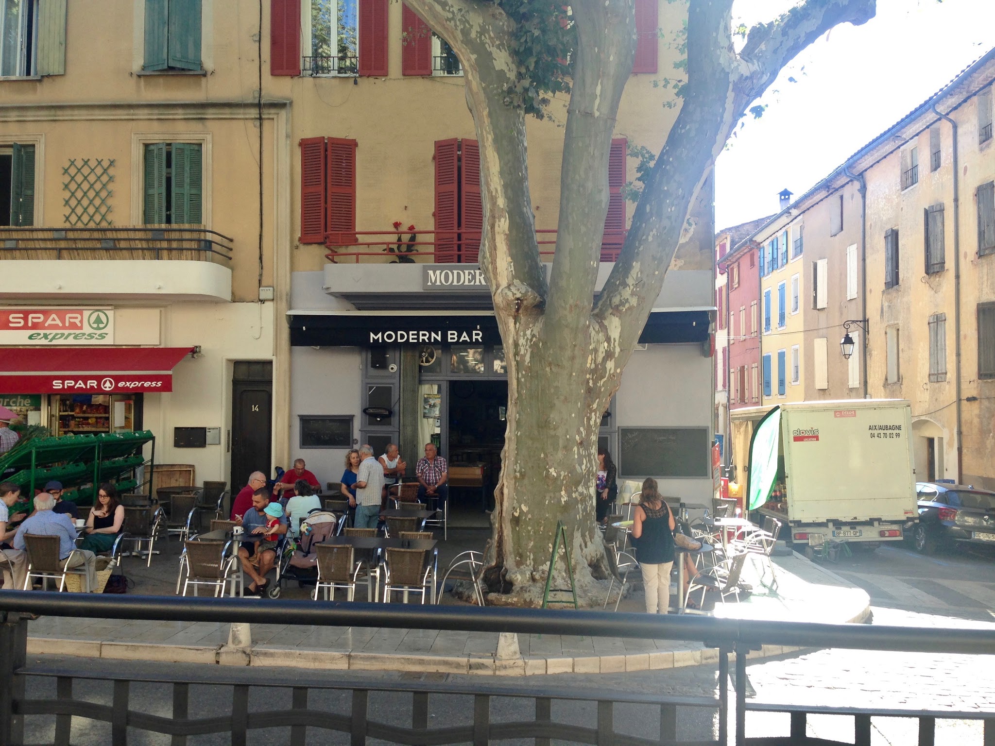Vous vous sentez coupable de rester assis à votre table en train de boire quelques heures avant le déjeuner ? Aucun problème. Le Modern Bar est l'endroit idéal pour se prélasser sous les arbres avec quelques Pastis avant de traverser la route en titubant pour déjeuner au Café Du Cours. Service sympathique et décontracté et jolie vue sur le village vaquant à ses occupations.