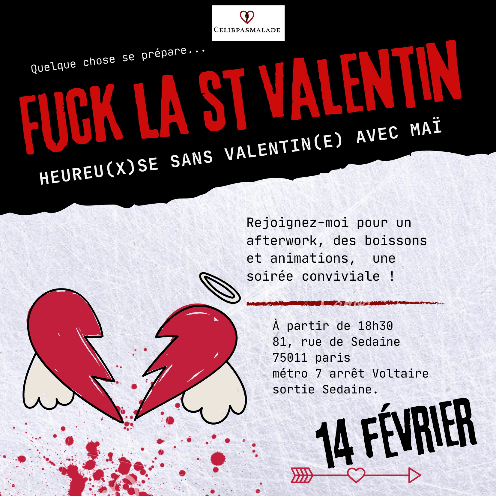 Le 14 février à 18h30 Soirée Heureu(x)se sans Valentin avec @celibpasmalade ❤🙌🎊🎉