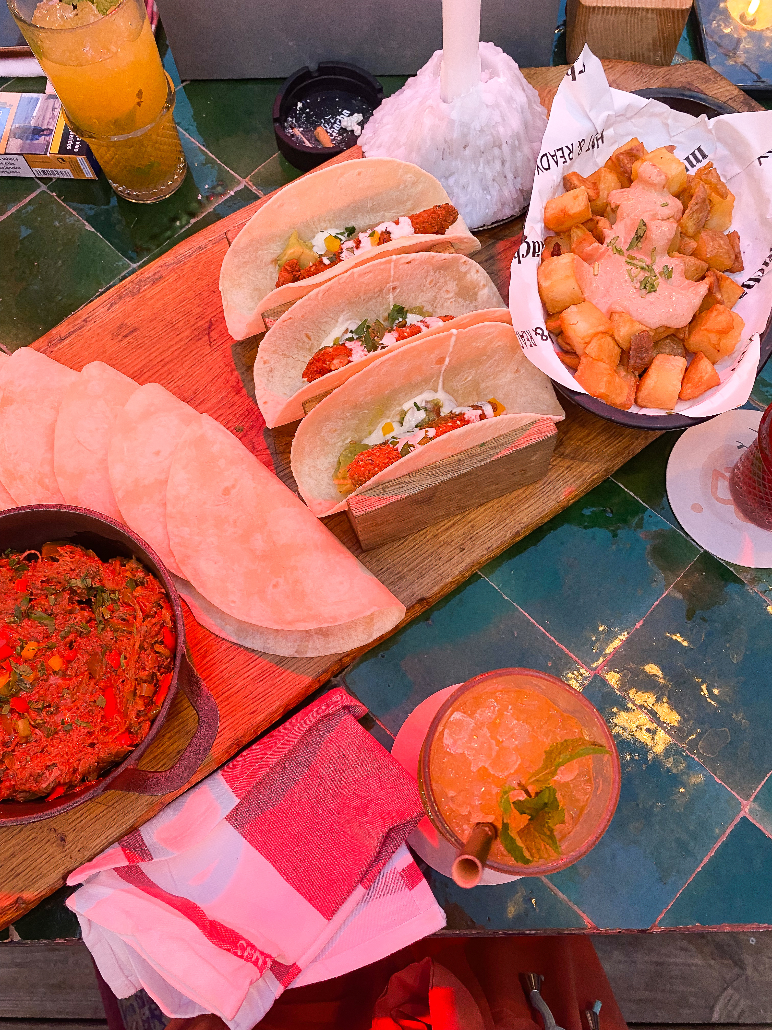 Cadre sympathique, verdoyant du coup dépaysant onn s y croyait presque. Partage d'une plancha, quasadillas et tacos .... la quasadillas vraiment trop petite malheureusement. Musique qui ne va pas avec le cadre. Prix assez élevés par rapport aux quantités