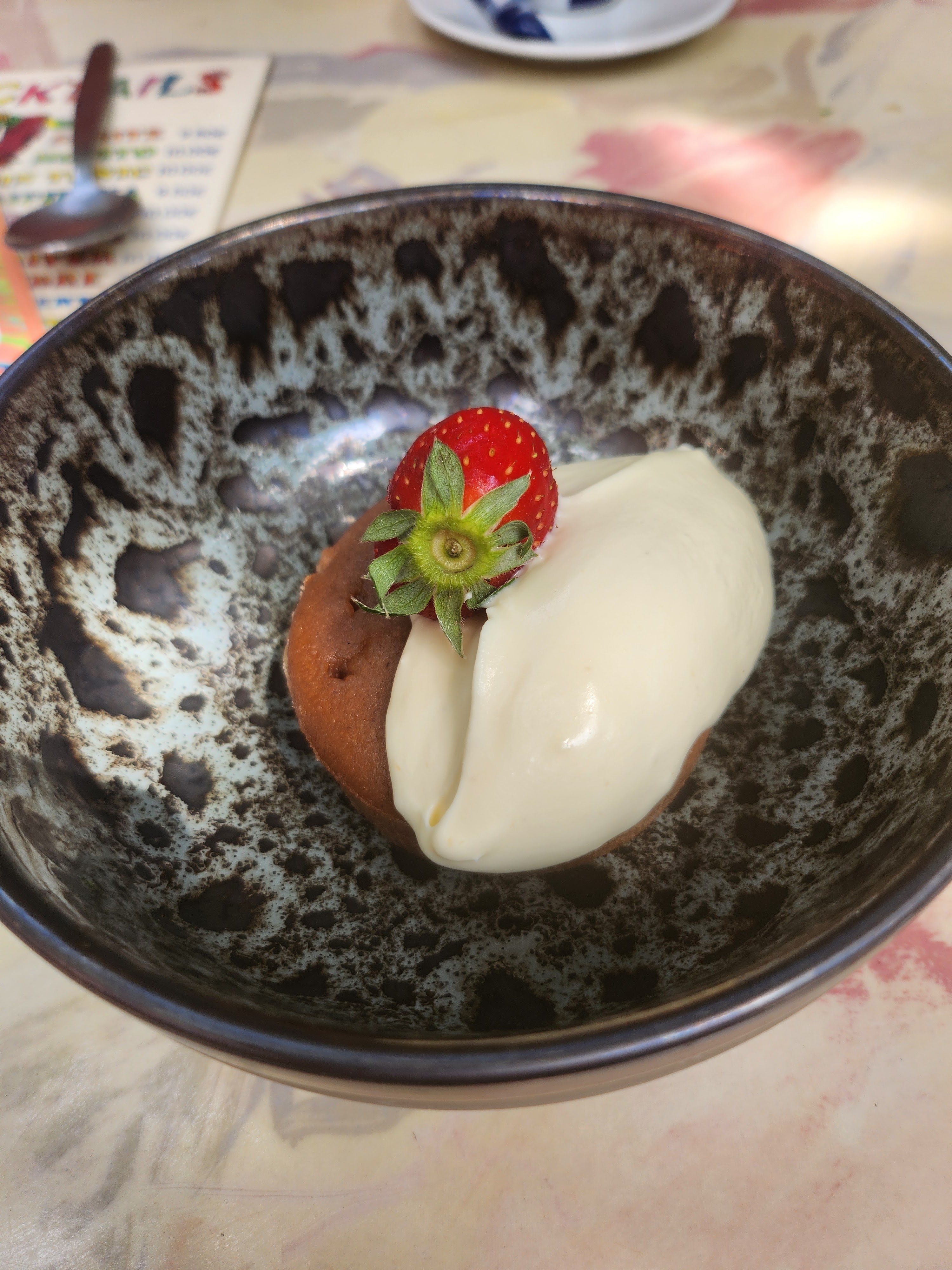 Repas le midi samedi 26 juin 2021 . Arrivé un peu dans ce patio par hasard, qu'est ce qu'on a bien fait de s'installer à l'ombre des arbres sous les ombrelles multicolores. Une carte de tapas concise qui laisse penser à un travail de produits frais. Gagné ! Et quel régal ! Une découverte d'association de saveurs, on a envie de goûter la carte entière. Le gravlax de saumon d'une fraîcheur exemplaire, la sauce mascarpone à l'aneth et gelée de mangue pour tremper les tempuras de Gambas, les falafels maisons. Etc.. On fini en beauté avec un fondante à la châtaigne tout en douceur. Je suis tatillon, gastronome et cuisine beaucoup, j'ai rien à redire. C'était parfait. Merci pour ce bon moment et ces découvertes.