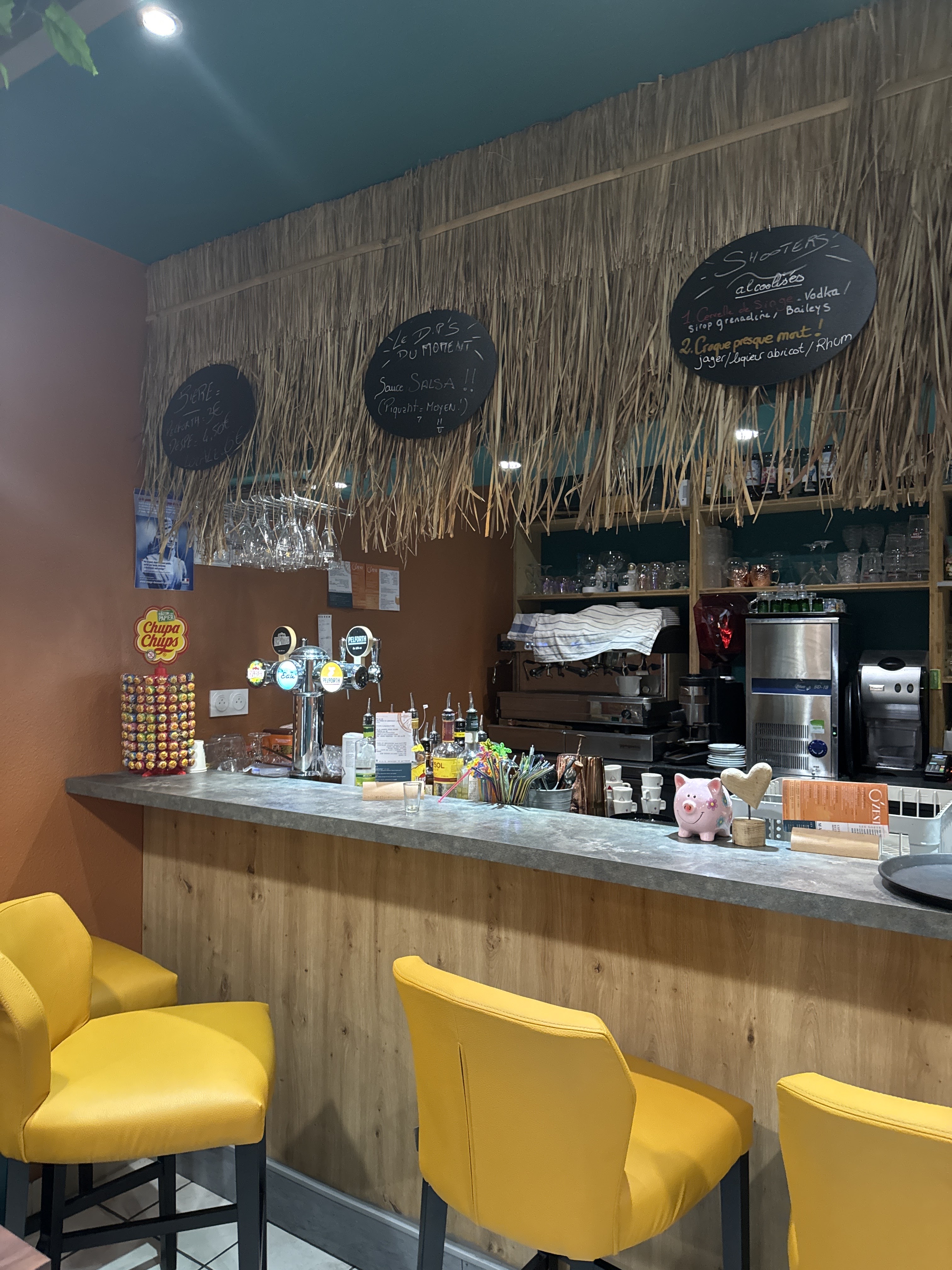 Nous avons poussé la porte de cette petite adresse, par un temps bien triste et pluvieux de Morez… Et heureusement que nous avons poussé cette porte… Nous en sommes repartis, recharger d’ondes positives, de chaleur, de soleil et de couleur dans nos cœur ! Cette adresse fait beaucoup de bien à la ville de Morez et au moral ! Un petit vent rempli d’énergie pétillante ! Ce lieu et tout autant vivant que sa propriétaire : Caroline : Souriante, disponible et vraiment très pétillante. Nous avons pris un cocktail de sa confection que Caroline nous a recommandé (Sur ces petites ardoises au-dessus du bar ). Très bon choix. Le breuvage était aussi coloré (que l’endroit) et tout aussi bon ! Nous avons choisit une planche pour accompagner : simple, sans chichi et surtout goûteuse aux couleurs du Jura : de la bonne charcuterie, du bon fromage et du bon pain : le tout 100% local (et ça, ça fait du bien !)… D’un côté les cocktails vous font voyagez sur des ondes merveilleuses outre mer et les planches pour les accompagner vous font découvrir le Jura si authentique, si bon…. Bref un mariage audacieux et osé mais surtout… réussi. Une famille de Lyon.