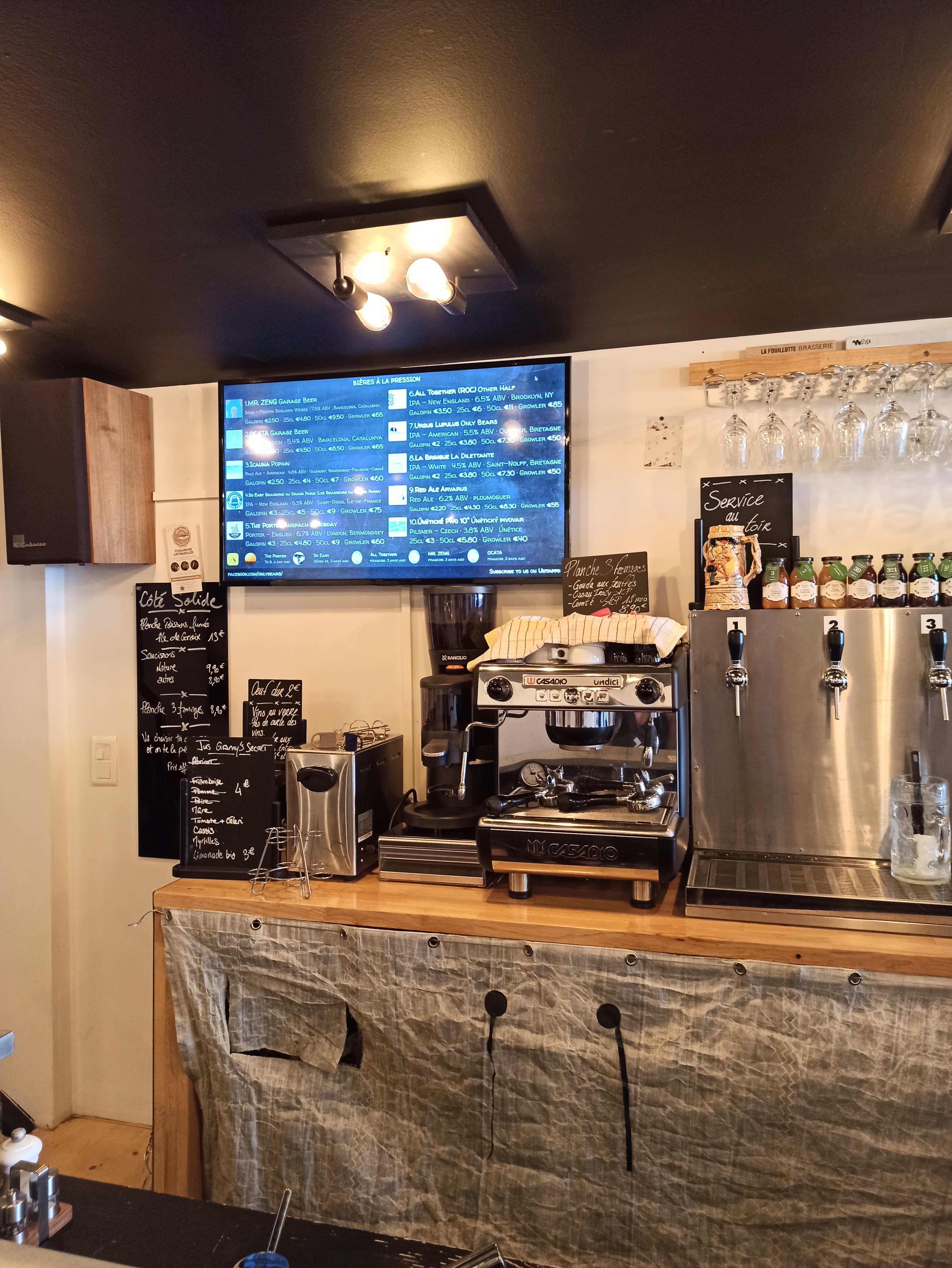 10 bières pression à choix (Bretonnes, françaises et étrangères). Vins natures. Divers autres alcools et jus de fruits. Bon fond musical.