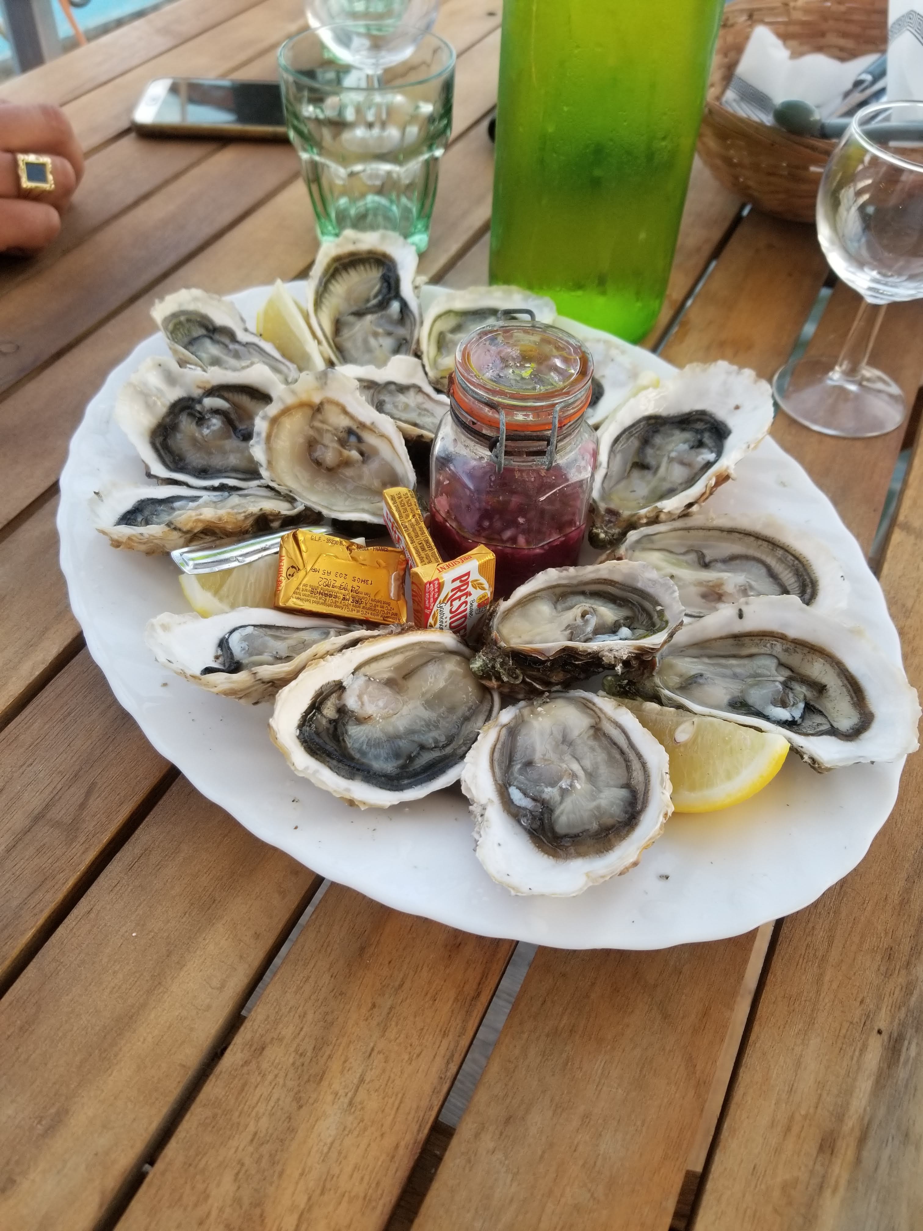 Les huîtres ne peuvent pas être meilleures que ça ! Extrêmement frais, directement de la mer. La seule boisson servie est le vin blanc Picpoul, mais c'est un accord parfait. Vous n'avez besoin de rien d'autre !