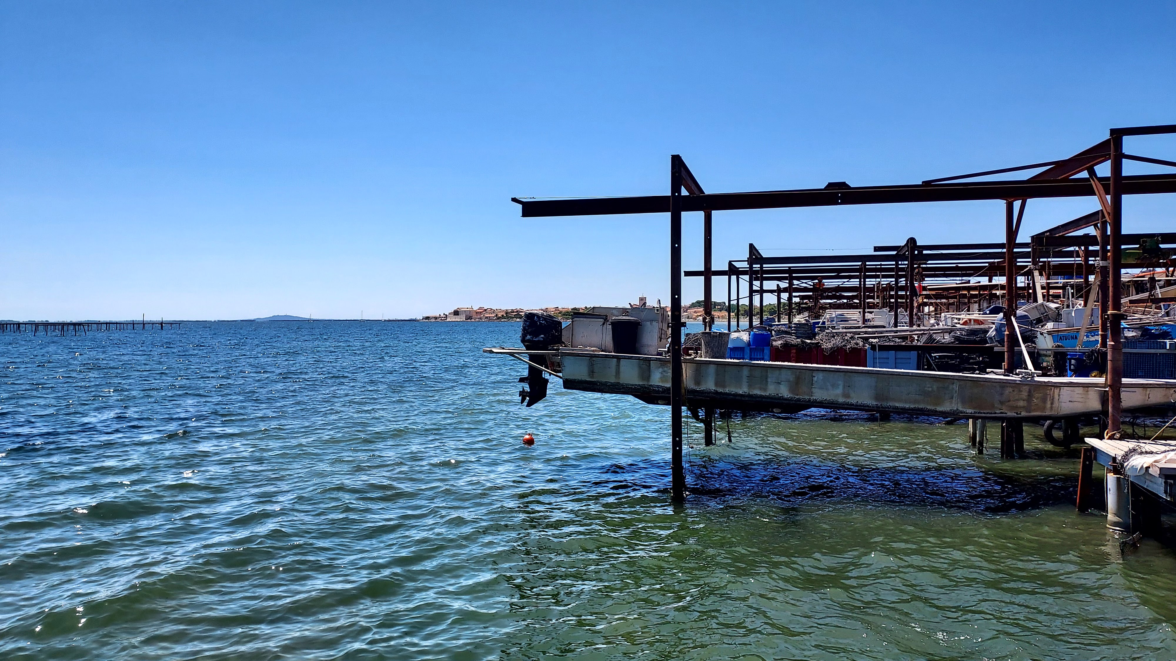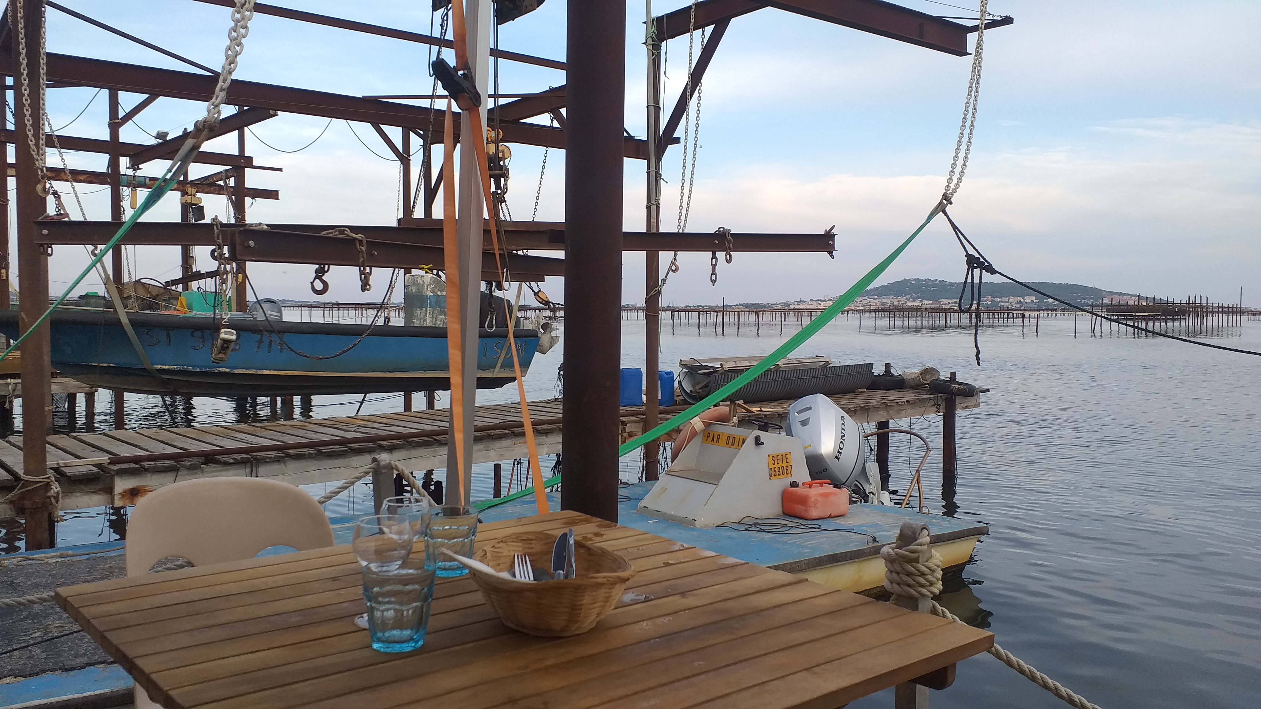 Un cadre rustique et perdu , idyllique , un petit ponton 6 tables au bord de l'eau face a l'étang de thau ses parcs a huitres et Sète . Huitres moules brasucades ... le bonheur