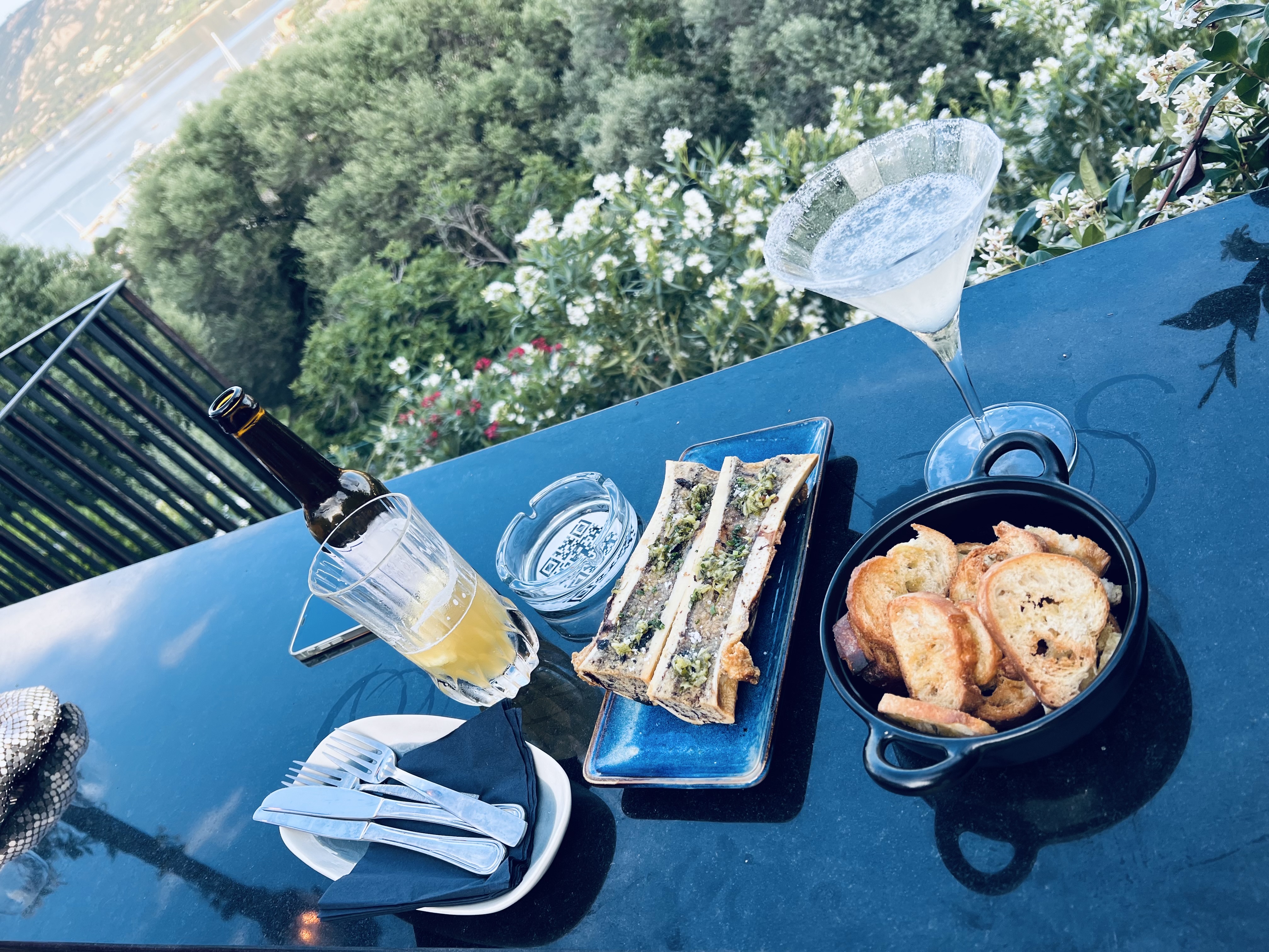 Petite pause pour boire un verre et grignoter à porto vecchio. Première surprise, la vue vraiment chouette, deuxième surprise les cocktails originaux et maîtrisés. Nous avons été très bien accueillis et servis !