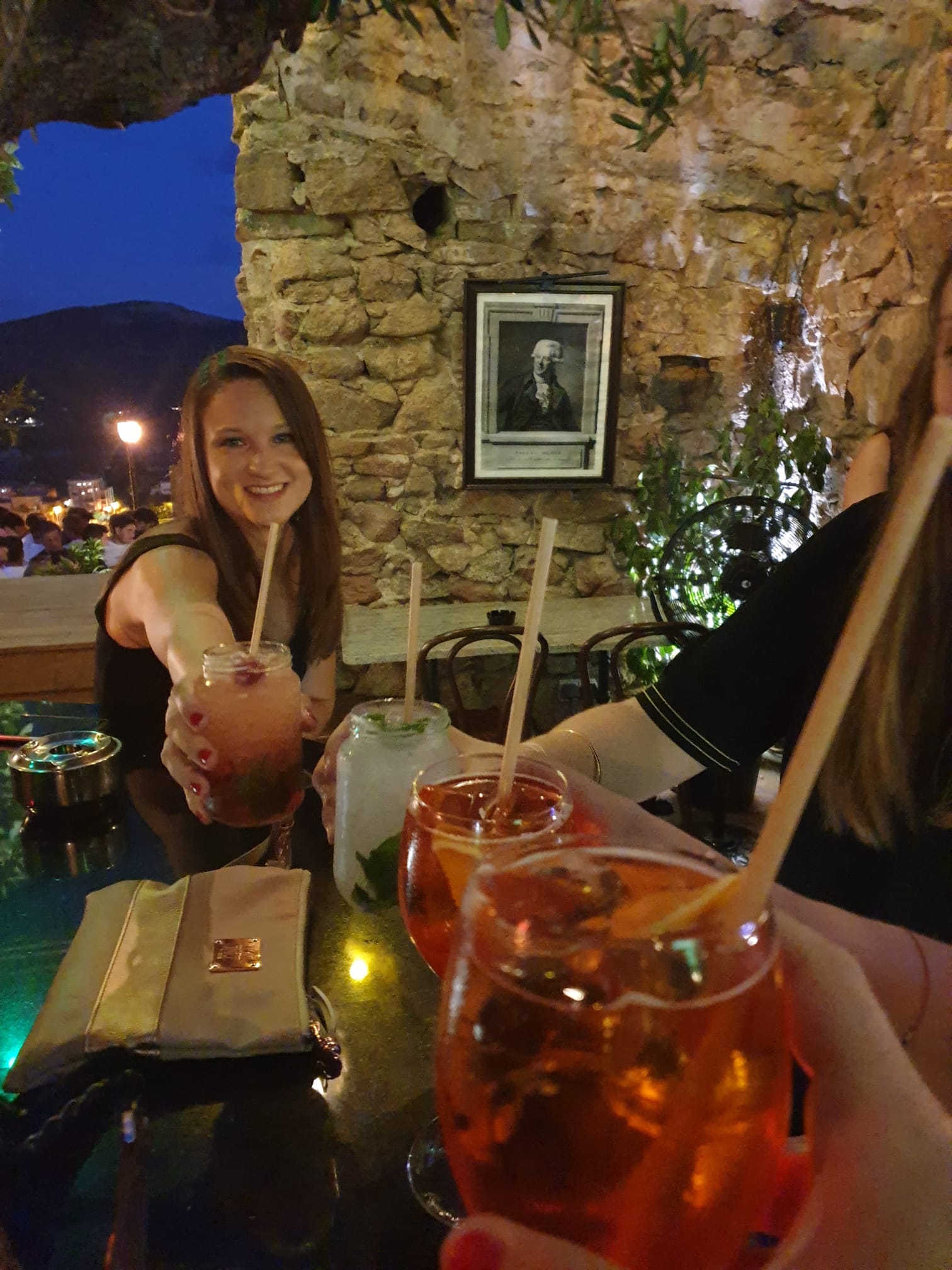 Top, on nous installes au bar sur la terrasse malgré le monde et les réservations à venir. Si vous voulez avoir accès à la terrasse il faut réserver 1 semaine à l’avance. Les cocktails sont très bons. Vue imprenable sur porto vecchio, et bonne ambiance
