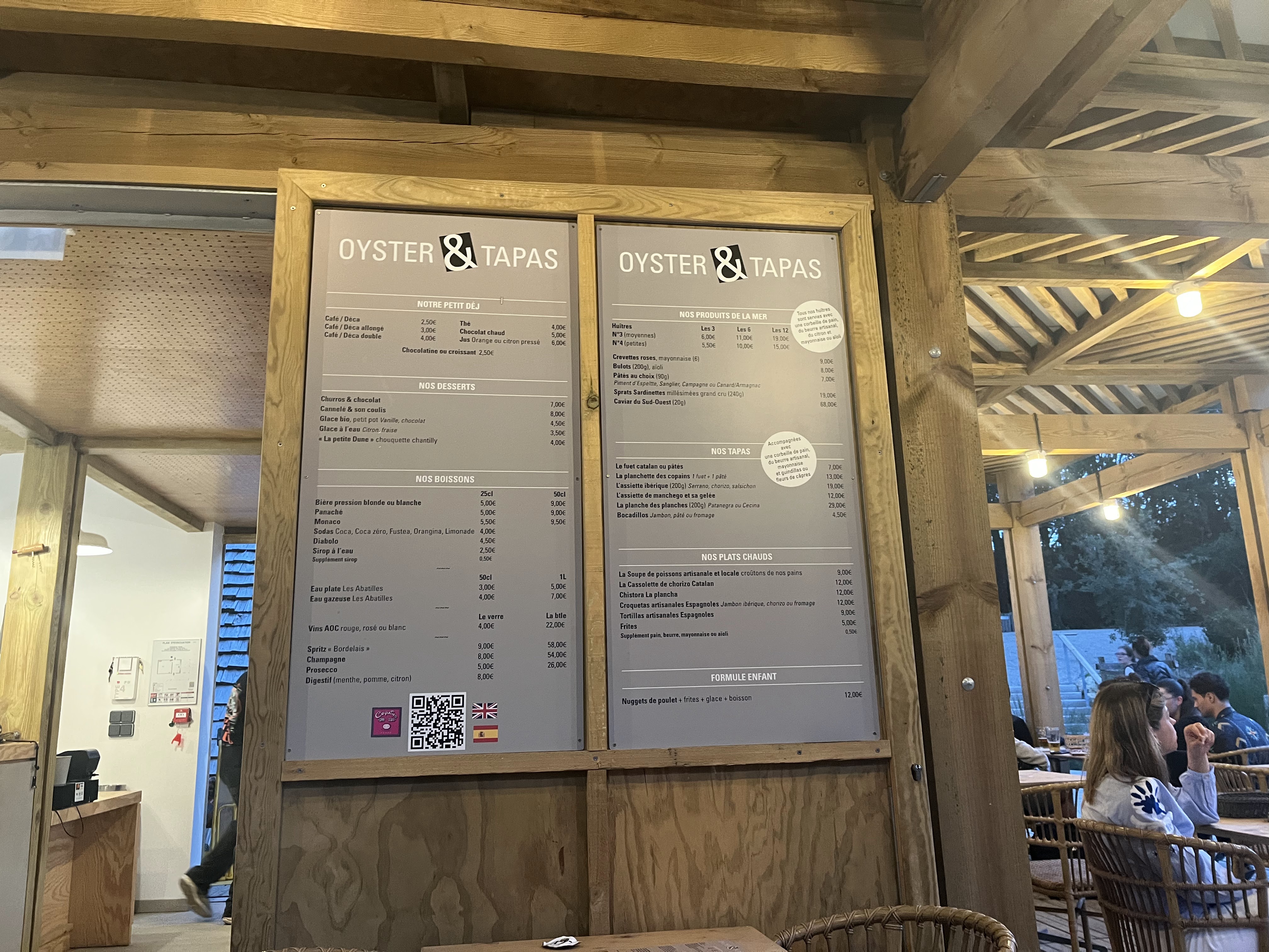 Petite cabane près de la Dune du Pilat où il est possible de prendre un apéritif à base de tapas et d'huîtres. Ma copine et moi avons opté pour une portion de 6 huîtres, un salchichon accompagné de croûtons, beurre et piments épicés et deux verres de vin. Facture totale de 26 €. Un peu élevé, mais ce n'est pas grave compte tenu de l'emplacement.