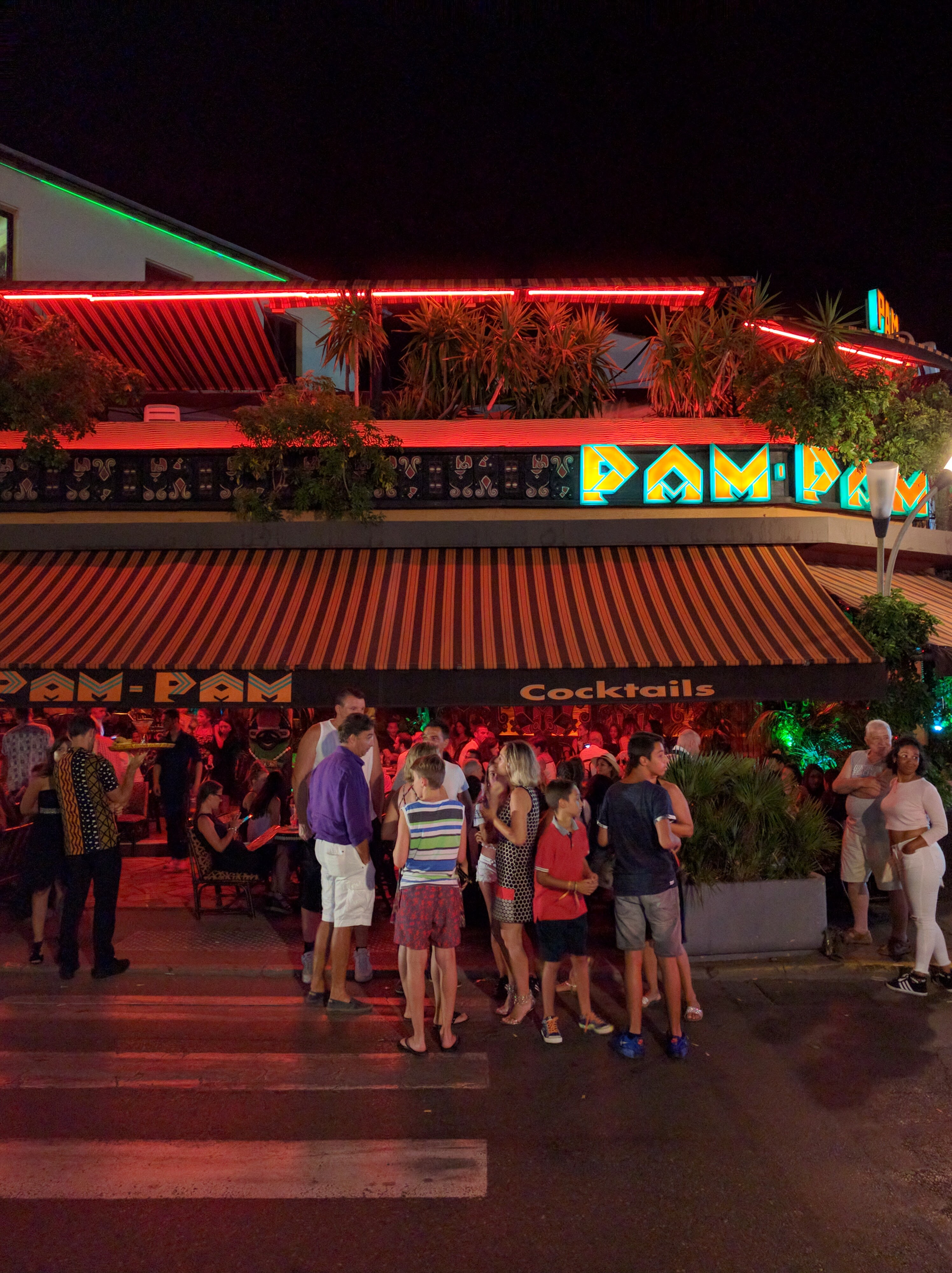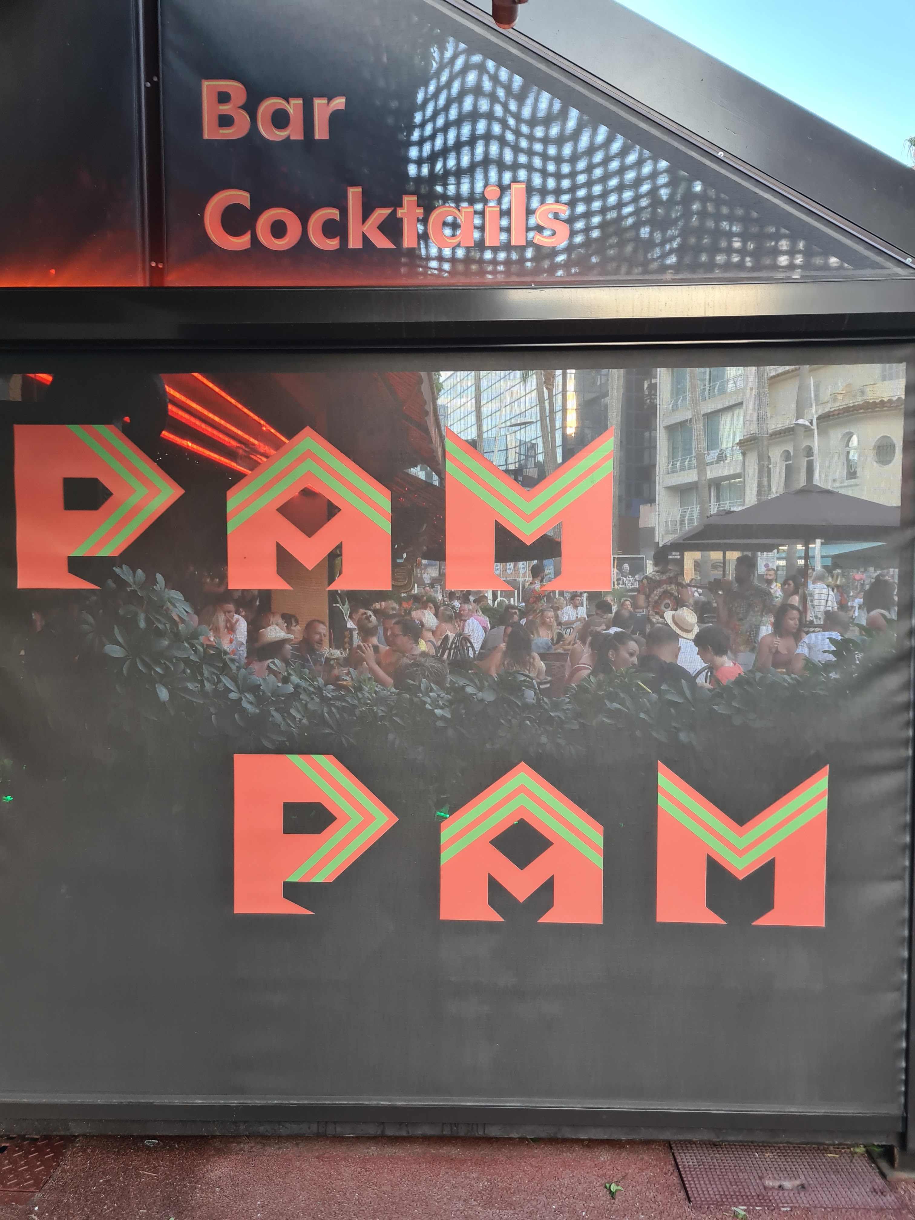 Pam Pam est d'abord un bar où on peut déguster des cocktails assez fortement alcoolisés et très parfumés. Très fréquenté le soir, on subit la musique très forte (plus qu'on n'en profite). Les danseurs/danseuses brésiliens font le show sur un podium avec un talent variable (mais peu importe, ça crée l'ambiance 😊). Passé 23h30-minuit ce bar devient l'une des rares terrasse encore ouvertes pour noire un verre dans les environs !