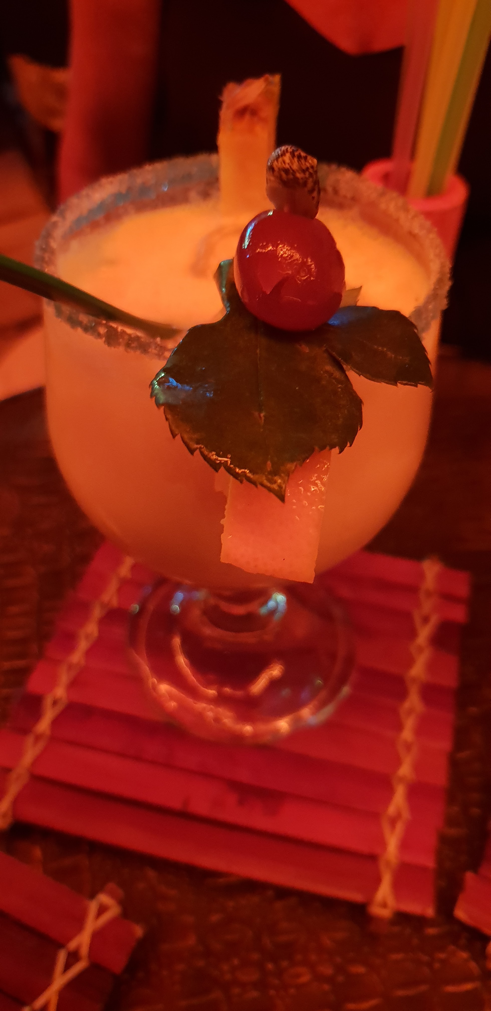 En arrivant, très bon accueil des serveurs, qui nous ont laissé nous installer où nous voulions. Le choix des cocktails est varié. Le prix semble à priori élevé (compter 14€ le cocktail), mais la boisson est accompagnée d’acras de morue, de chips, et de cacahuètes et popcorn (les deux derniers à volonté !). L’atmosphère du bar est originale, accompagnée de musique en cohérence, lui donnant une ambiance exotique très agréable. Finalement, les glaces, très copieuses, sont parfaites pour deux personnes. Je vous recommande d’aller en début de soirée à ce bar (et pas besoin d’aller au resto après !).