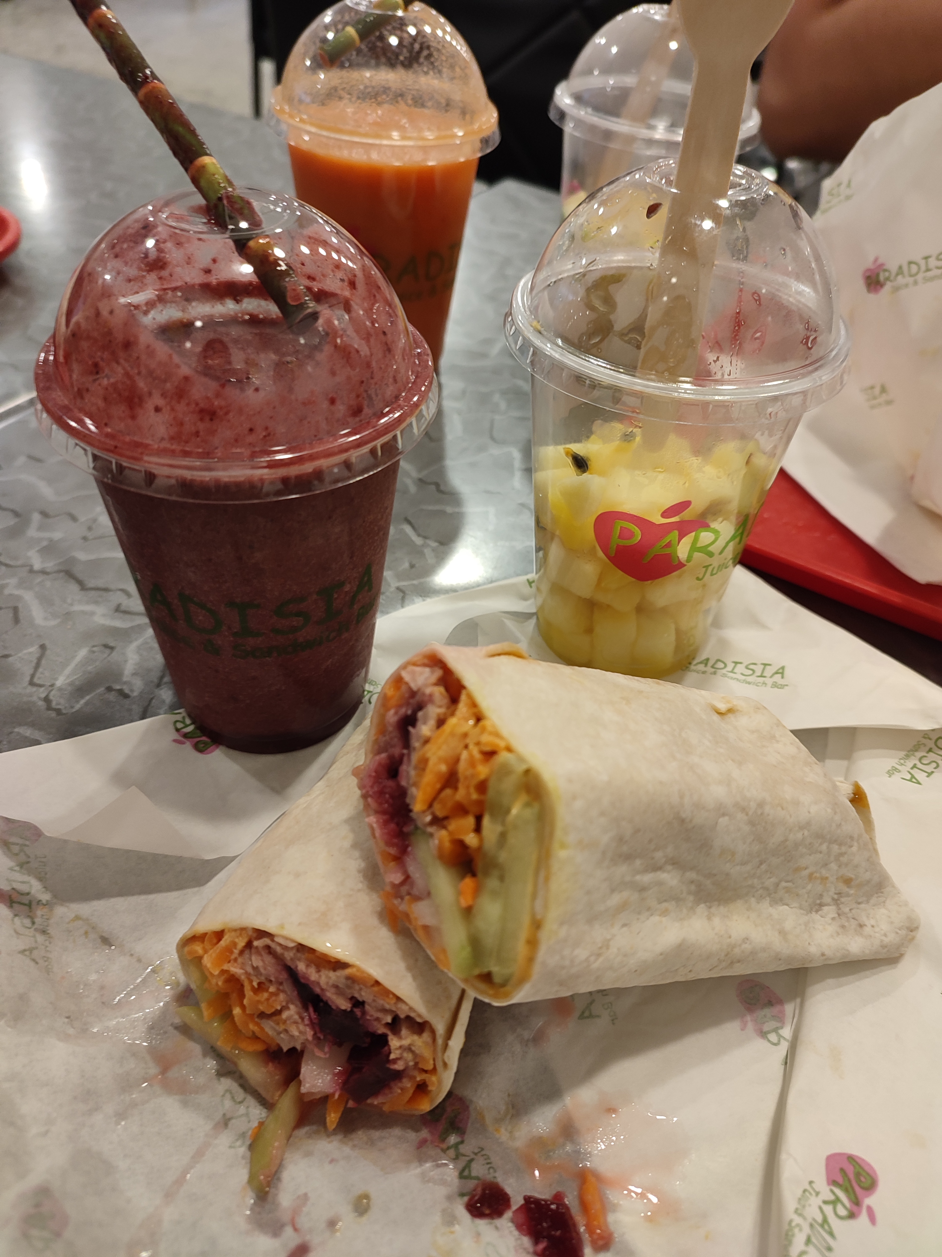 Tout ce qu'ils font est excellent. Les wraps, les smoothies, les jus, etc. Je ne vais pas à Centre Deux exclusivement pour le Paradisia non plus mais si je dois faire un achat du temps de midi, c'est l'endroit où je vais aller en priorité puisque je sais que je pourrais manger au Paradisia. Et pour finir les gens qui y bossent sont tous vraiment cool, c'est vraiment le coin chill de C2.