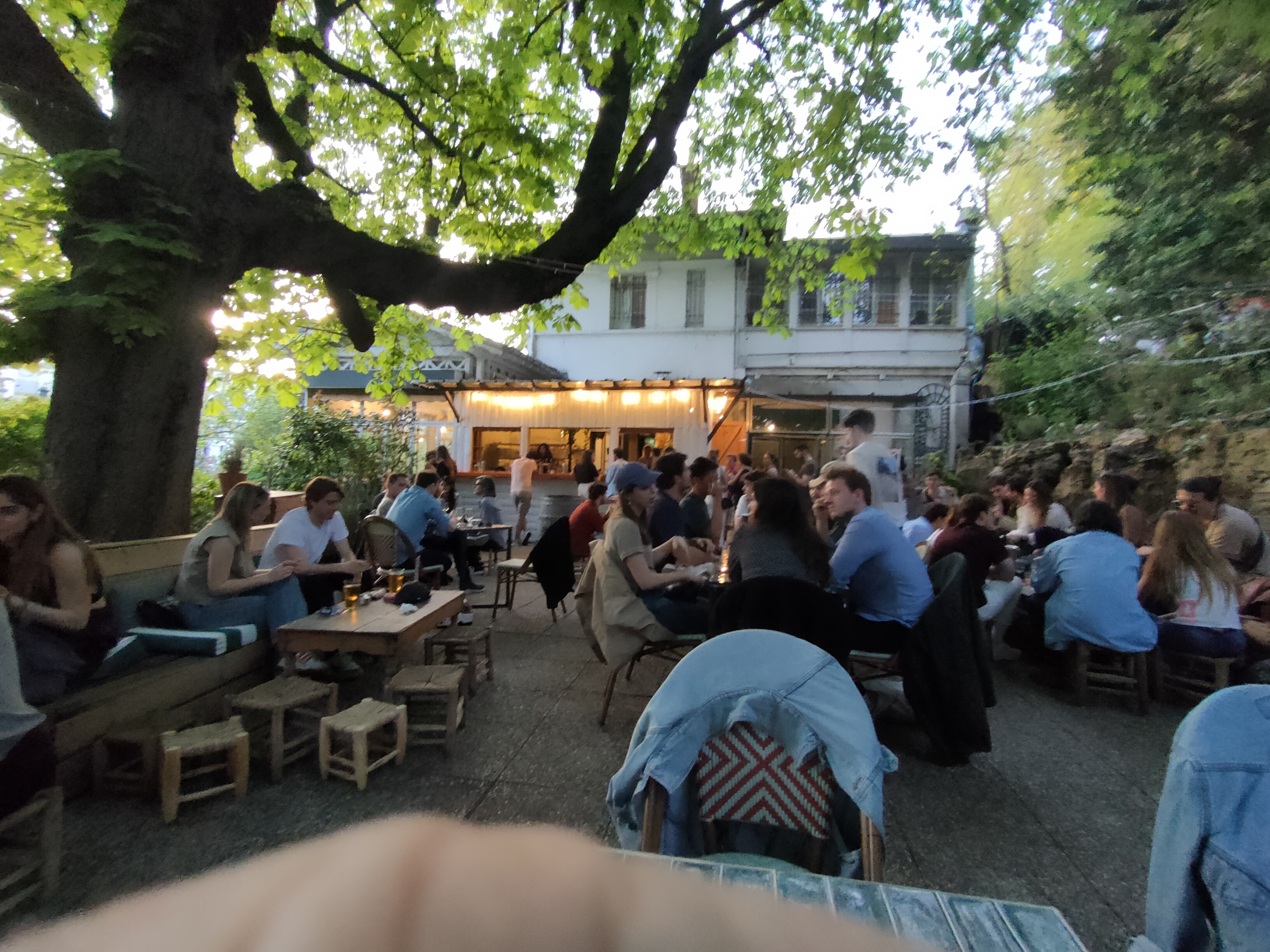 Super ambiance, le lieu est franchement ultra sympathique dans les Buttes Chaumont avec des lampions dans une nature agréable. Un côté extérieur, une petite salle avec DJ pour danser, un côté bar et fumoir hyper cool ! Mention spéciale pour des shots au piment ! Des sièges pour faire la queue aux toilettes..bref une vraie adresse parisienne qui vaut le détour