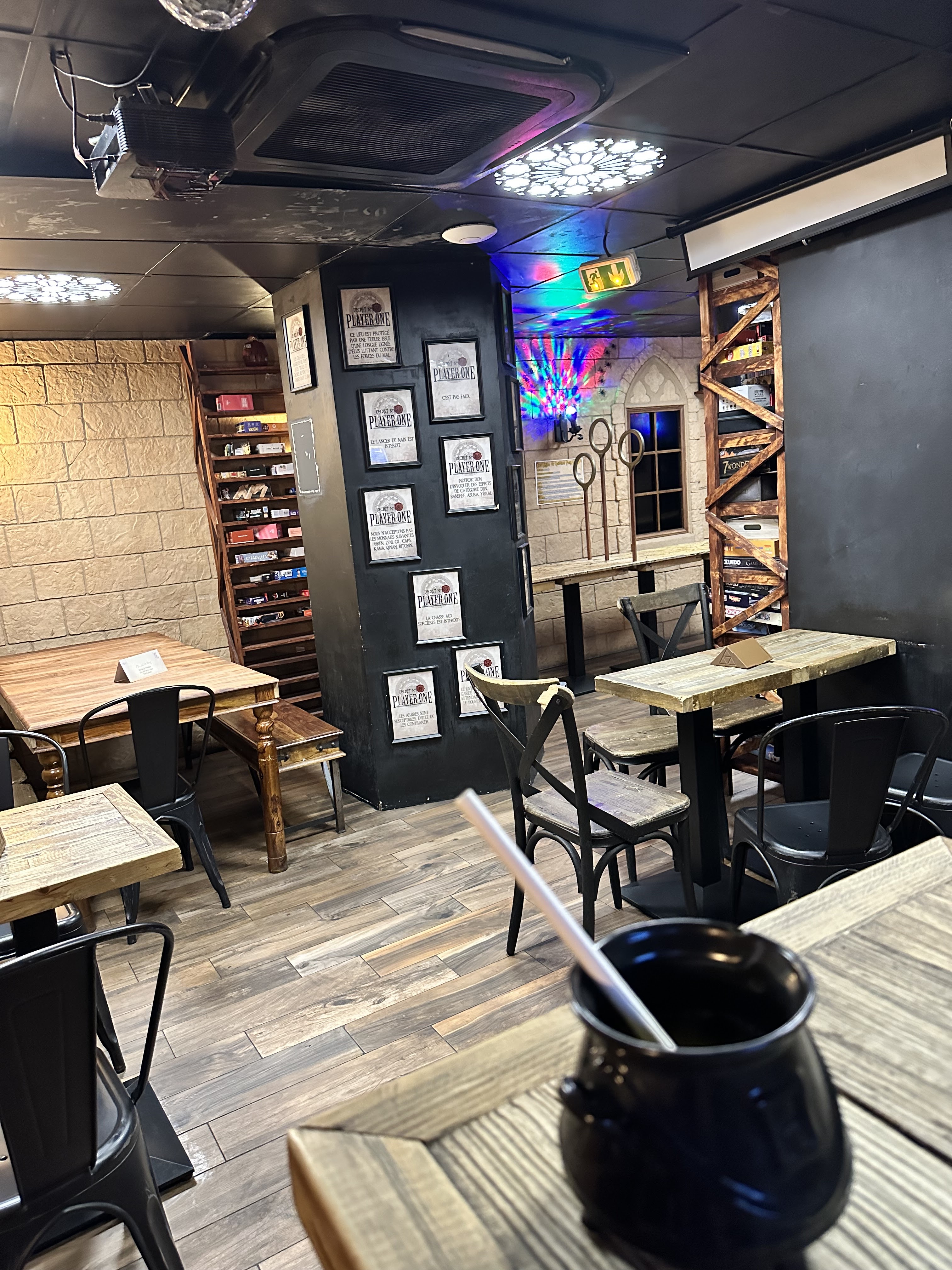 Super lieu où on peut jouer à plein de jeux de société une salles spécialisé sur Harry Potter des toilettes pimper LEGO avec des musiques qui donnent envie de rester dedans. Une tables transformer en NES où l'on peut jouer à Mario. Et il y a des petits trucs à grignoter. Je le conseille les yeux fermés, enfin non plutôt ouvert ;) haha