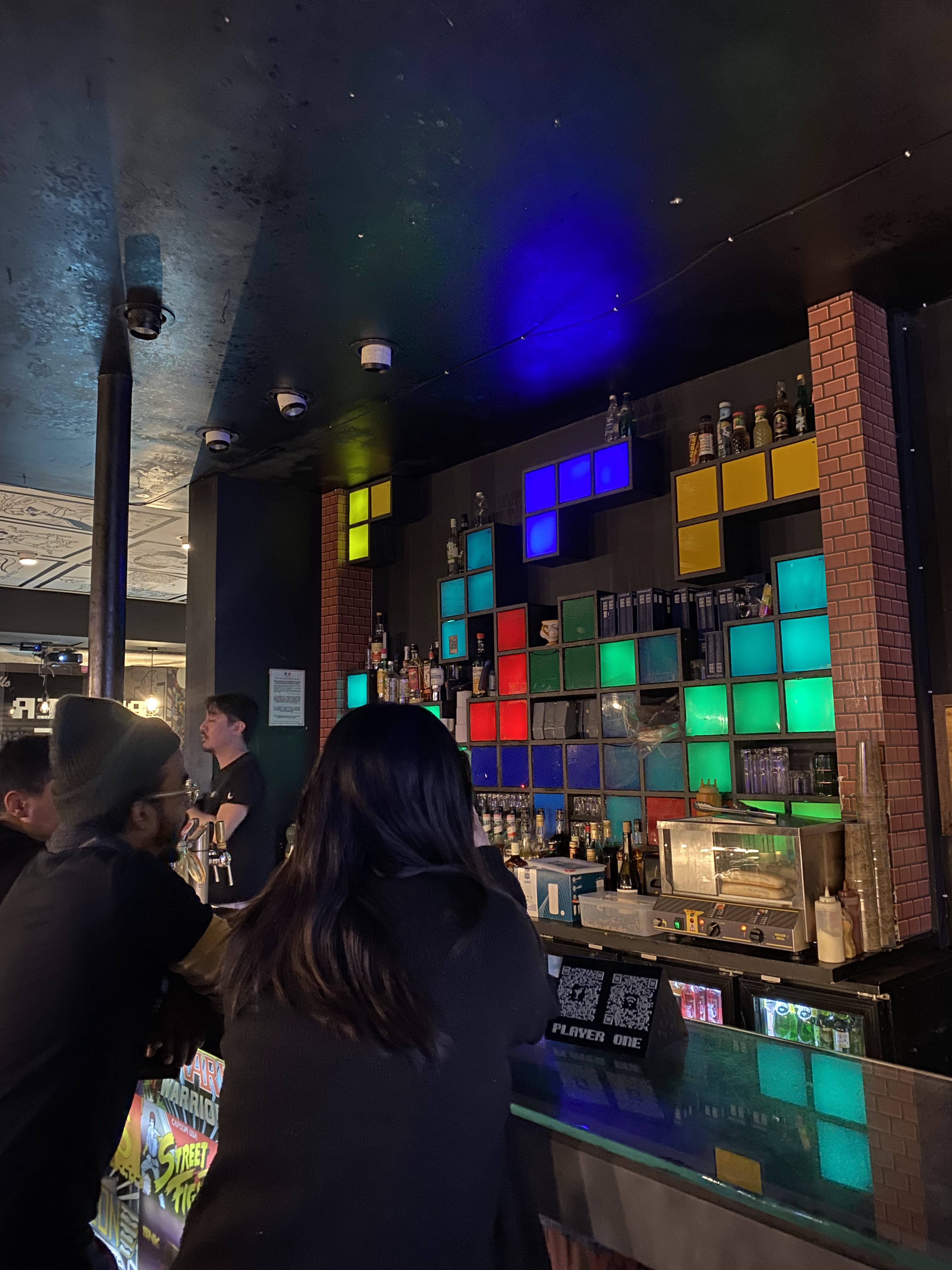 Bar très sympa dans l'ensemble, n'étant pas fan du bruyant les distractions de jeux vidéo m'ont fait plus ou moins oublié ce détail, les cocktails sont très bons et accompagnés de jeux c'est encore meilleur ! Super moment ☺️