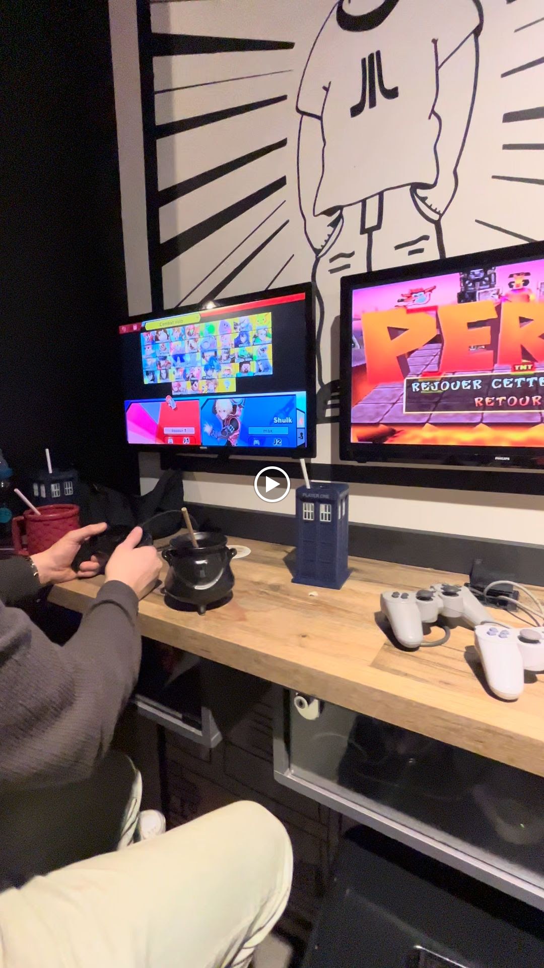 Les noms des boissons étaient géniaux. La plupart des jeux étaient super nostalgiques. En voici quelques exemples : SoulCaliber 2, Super Mario Bros 3 (avec un énorme contrôle Nintendo), Pokémon 64... si vous êtes à Paris et que vous cherchez un endroit pour vous détendre avec quelques jeux et un bon verre ta main, je recommande sérieusement cet endroit