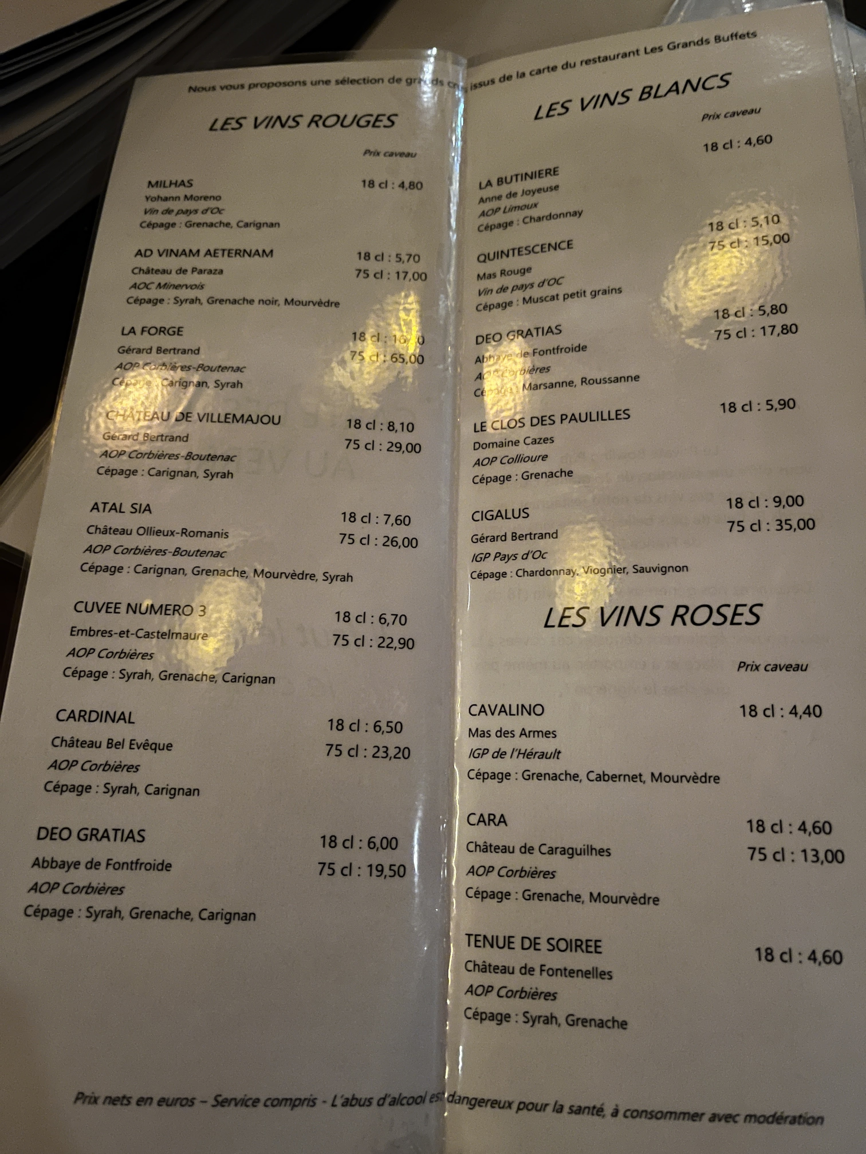 Hier, je commande un verre de vin rouge pour mon ami. Le serveur nous l’apporte avec le ticket (17€). C’est tout naturellement que le serveur a apporté le vin au verre le plus cher (16€80 alors que le verre tourne autour de 6€50 en moyenne). Il ne s’est pas démonté sur les explications. Il prétexte ne pas être choqué car lui-même venant de PACA, les tarifs des vins sont élevés par rapport au narbonnais. Bref, tout cela afin que demandé bien la carte, avec le vin que vous aurez choisi et pour ne pas que ce serveur n’abuse de votre sympathie.