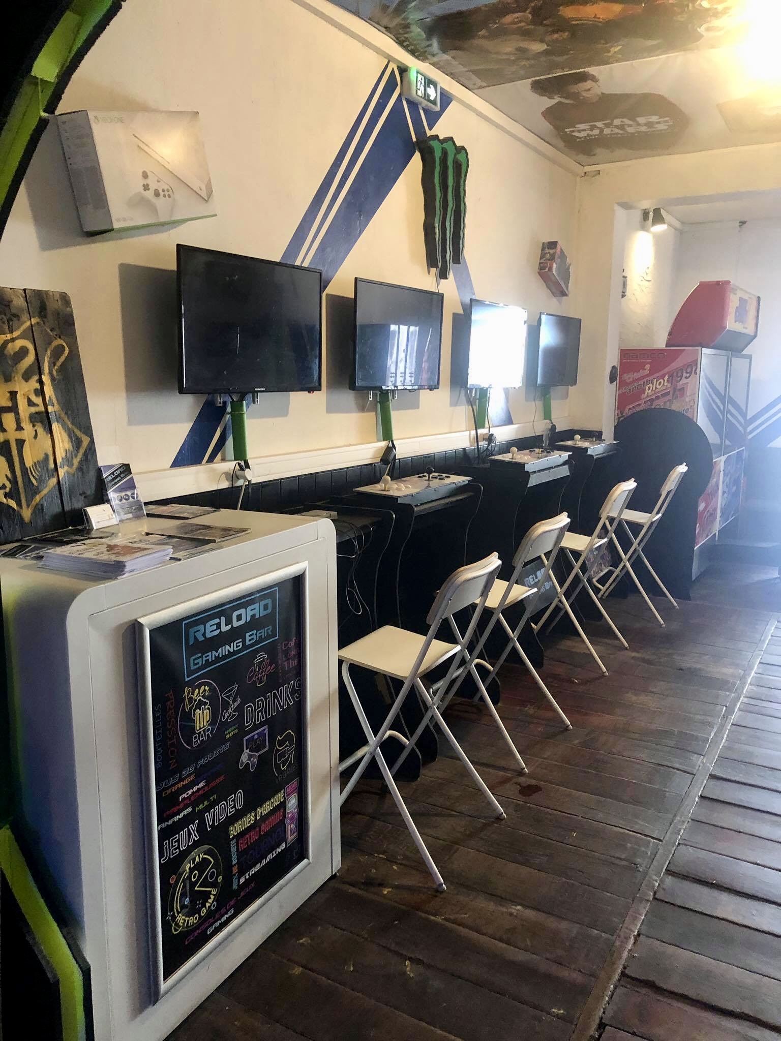 Premier Bar Gaming sur Douai. Le concept est simple, tu consomme une boisson est en contrepartie tu peux jouer à ce que tu veux. Bornes d’arcades, consoles, PC. Bref vous avez le choix. Il y a également des tournois avec des cadeaux à la clé pour le vainqueur. Les propriétaires du Reload sont super sympas. Que des points positifs!