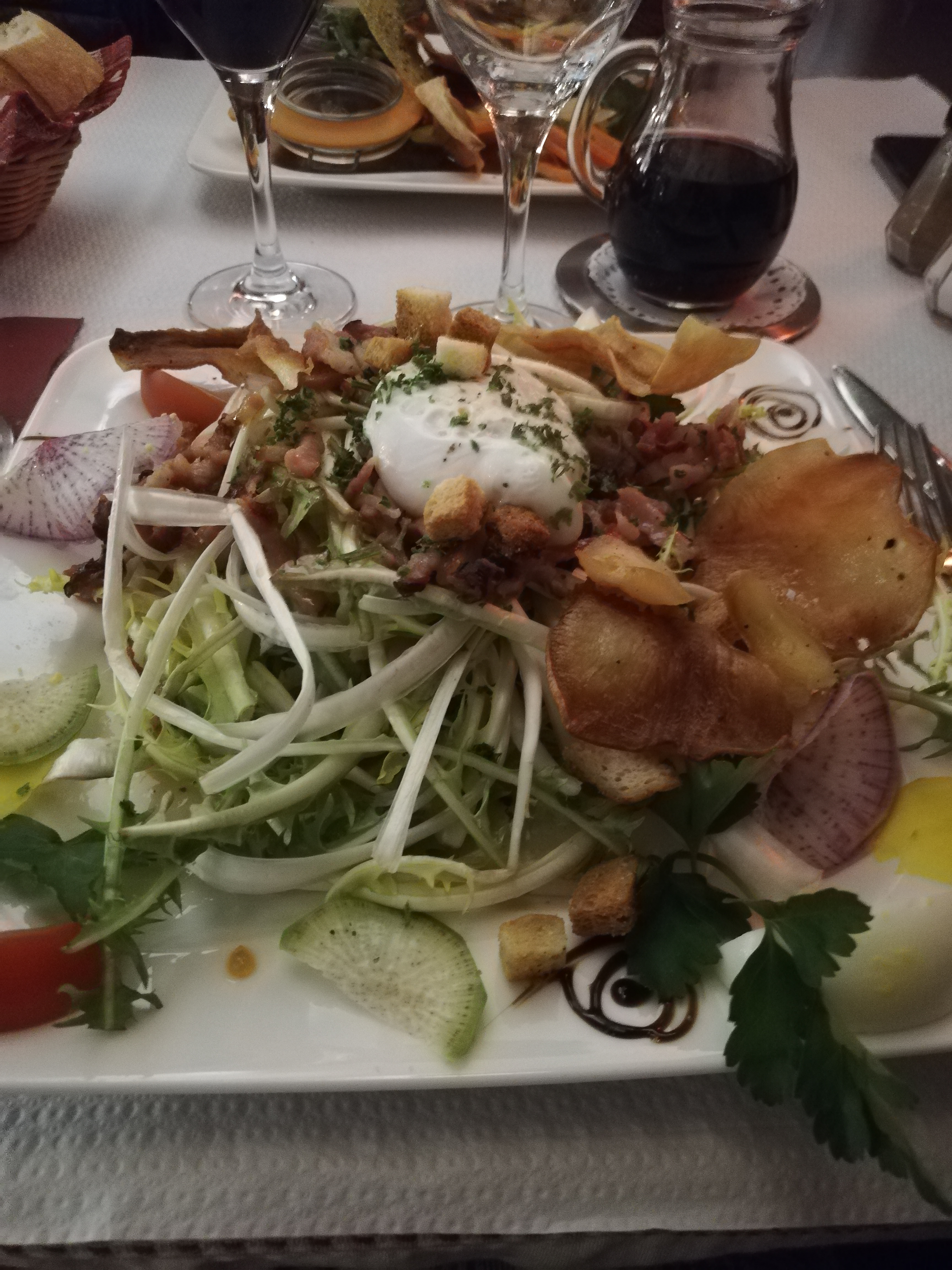 Excellent de l'entrée au repas. Escargot 🐌. Salade de pissenlit. J'ai adoré le petit pichet pour un verre de Gewurtztraminer