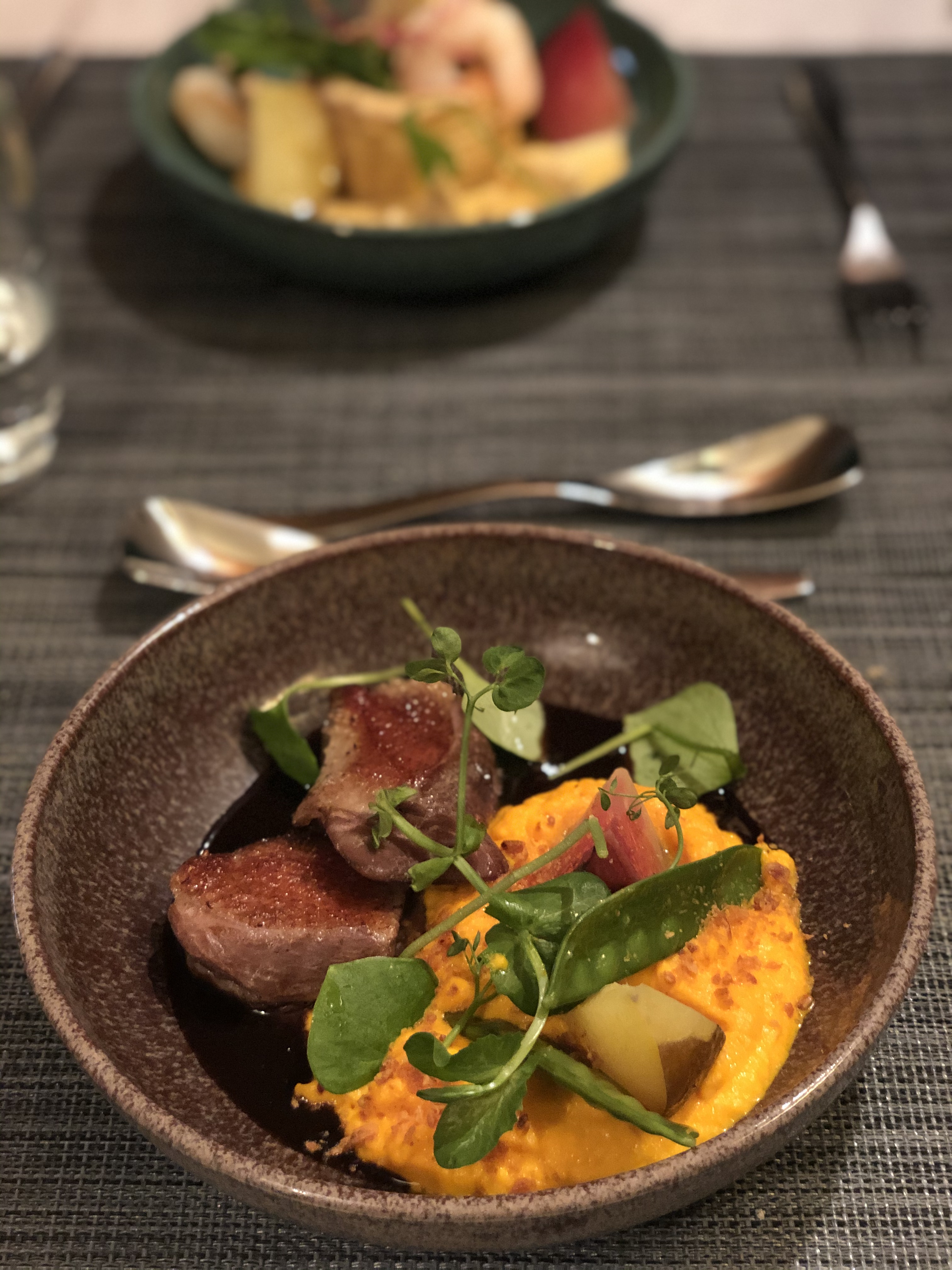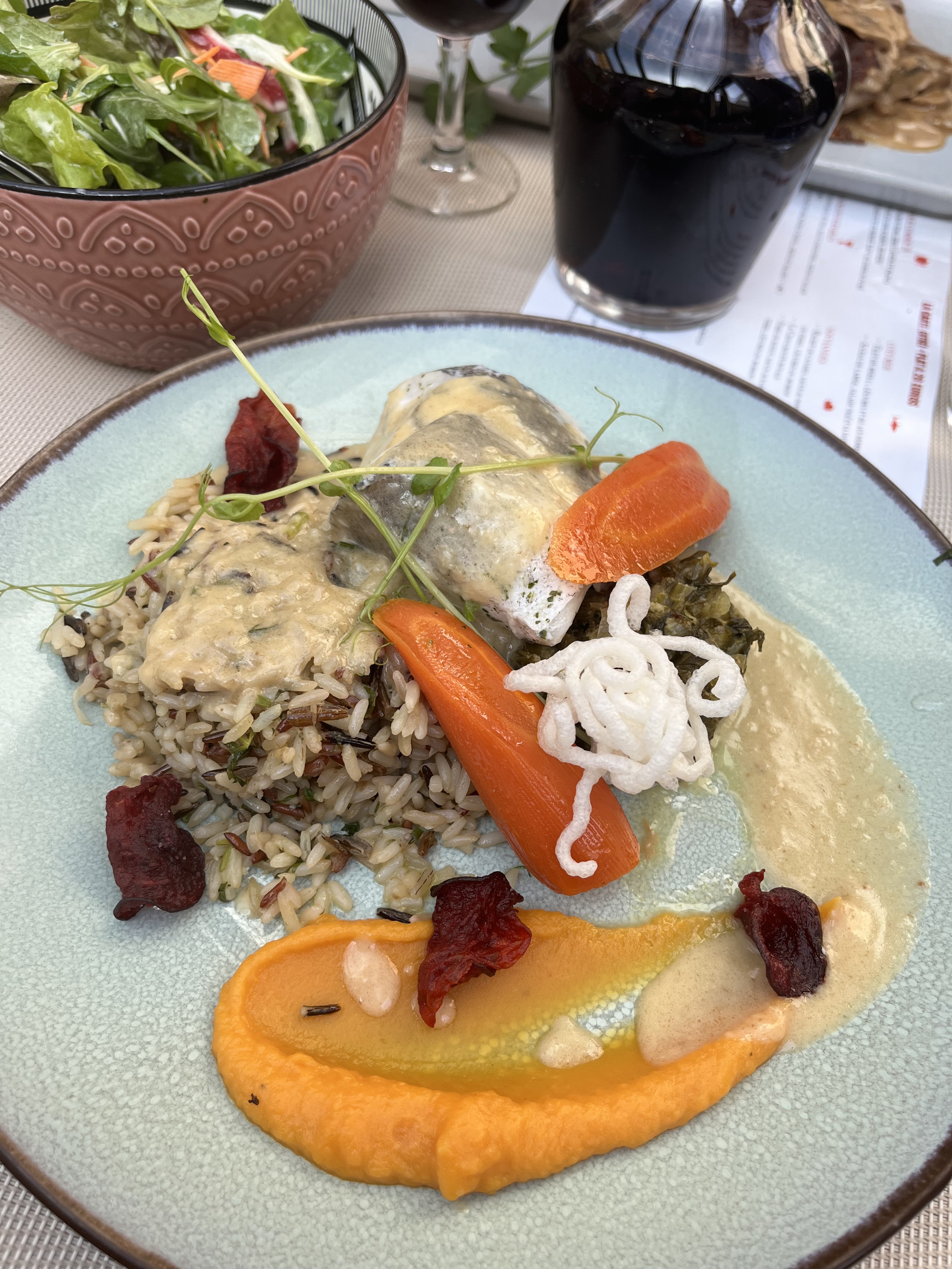 Excellent suprême de pintade avec flan de courge et légumes. Une très bonne adresse où nous retournerons ! Et le patron prend la peine de passer vous voir pour avoir votre avis 👌
