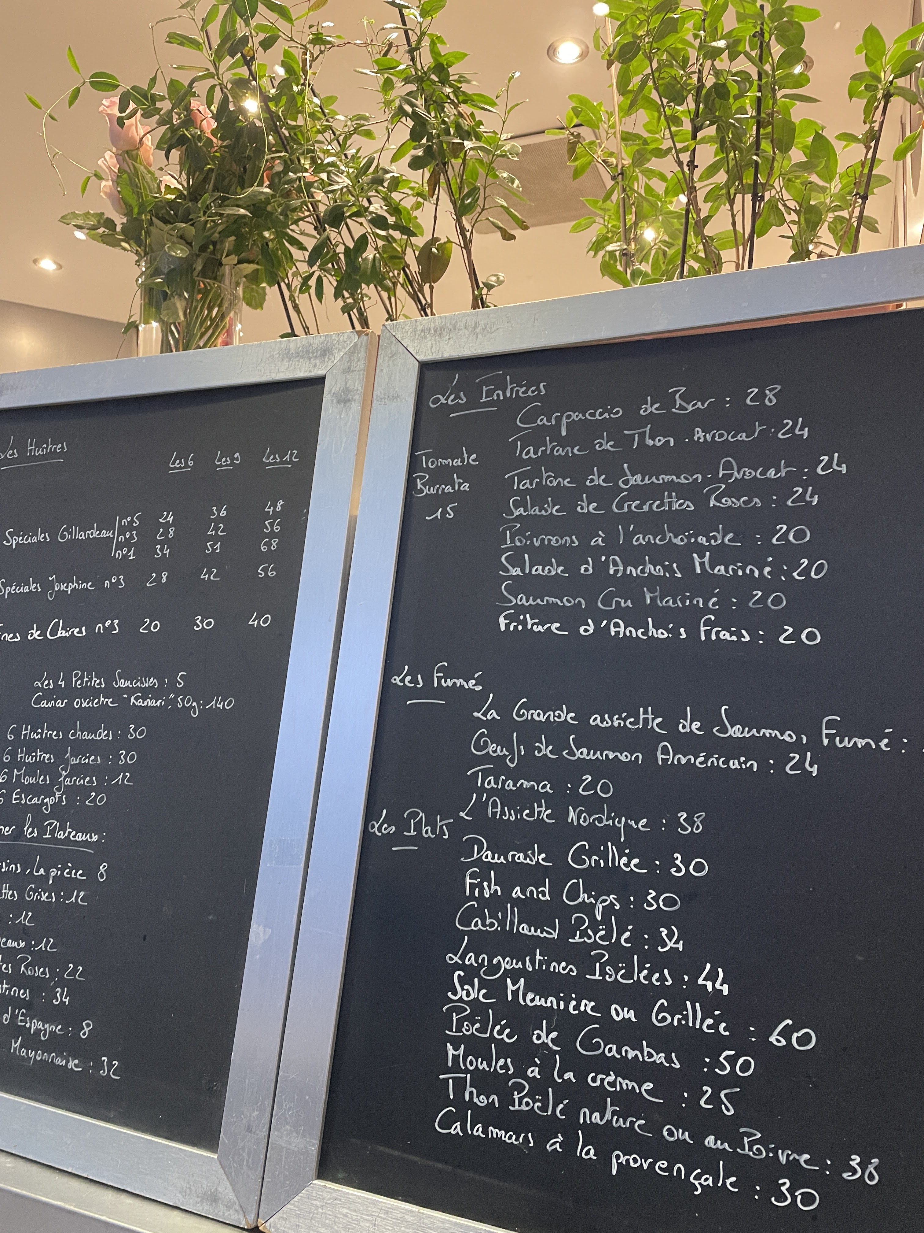 Les huitres : très bien sélectionnées et très bien préparées. les bulots idem. Les saint-jacques par contre étaient 8 petites pétoncles avec une tomate au milieu du plat… les légumes en garniture autant que vous voulez c'est ok. Mais franchement les 42€ pour les saint-jacques c'est indécent. Mon addition avec 3 verres de rully 1er cru (excellent) était trop élevée à mon goût. Service gentil, beaucoup de serveurs. Les tables sont très serrées. Rationnellement je les comprends ; comment s'en sortir sans pratiquer des prix élevés ? mais moi ça m'a un peu gâché le plaisir.