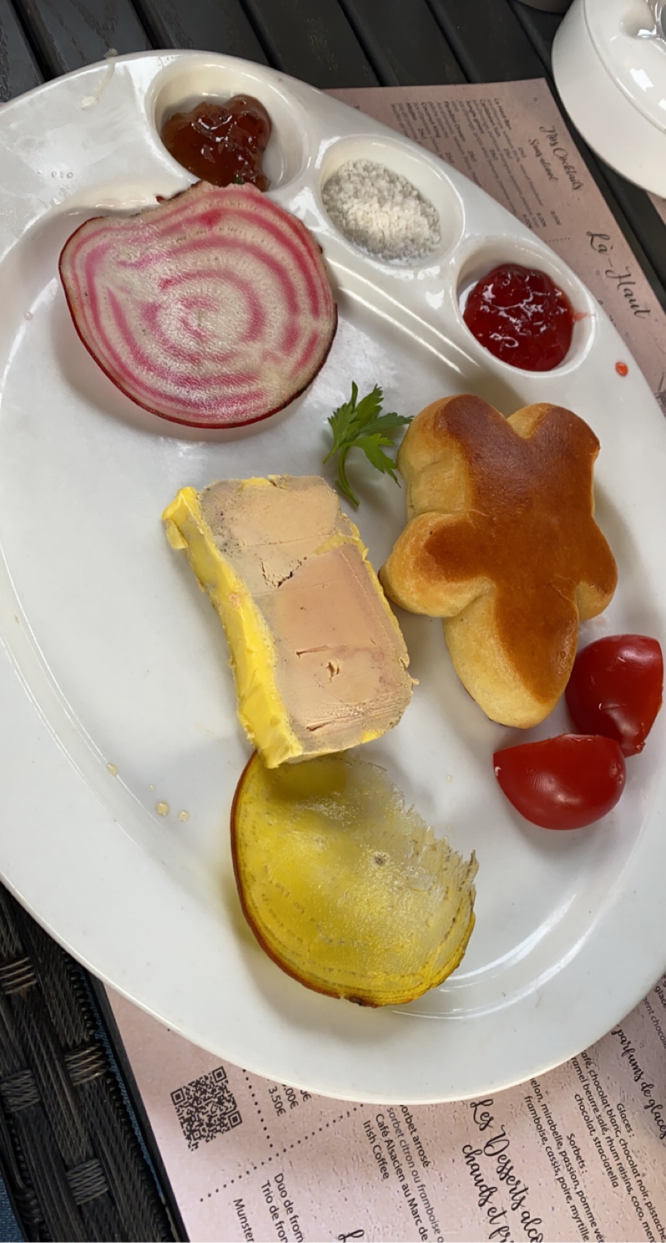 Venu ce jour pour le repas du soir , installer en bordure de terrasse avec vu sur la jolie chapelle ça c'est sympa. Repas pas mauvais mais pas exceptionnel non plus , par contre a la fin du repas j'ai remarqué que le ramequins où étais le bibeleskases était un peu sale a l'extérieur, je les gentiment fait remarquer au serveur qui n'a pas pris en compte la remarque ni même un simple désolé il a simplement pas répondu Service assez expéditifs ,pas spécialement chaleureux mais correcte dans l'ensemble. Le Mr a la fin a l'encaissement était lui plus chaleureux souriant et sympathique