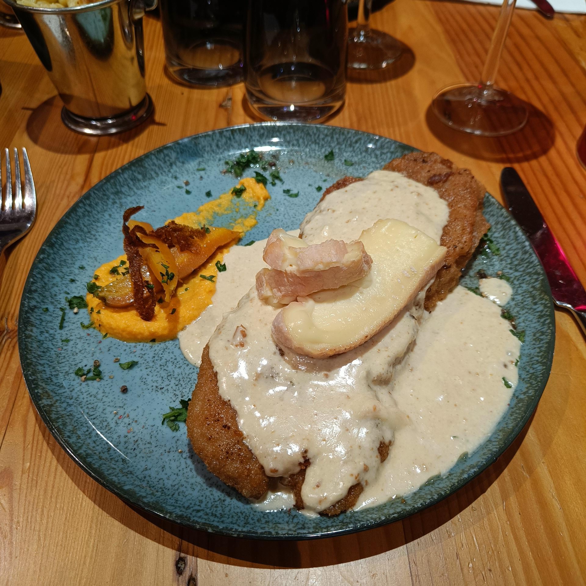 Intérieur très sympa. Amateur de cordon bleu je suis très déçu. Une poignée de frites, un PETIT cordon bleu qui ne casse pas des briques et pour un tarif de...... 24€ juste le plat... À ce prix là je m'attendais au meilleur de toute ma vie, ce fut l'inverse... Heureusement que le personnel est au top.