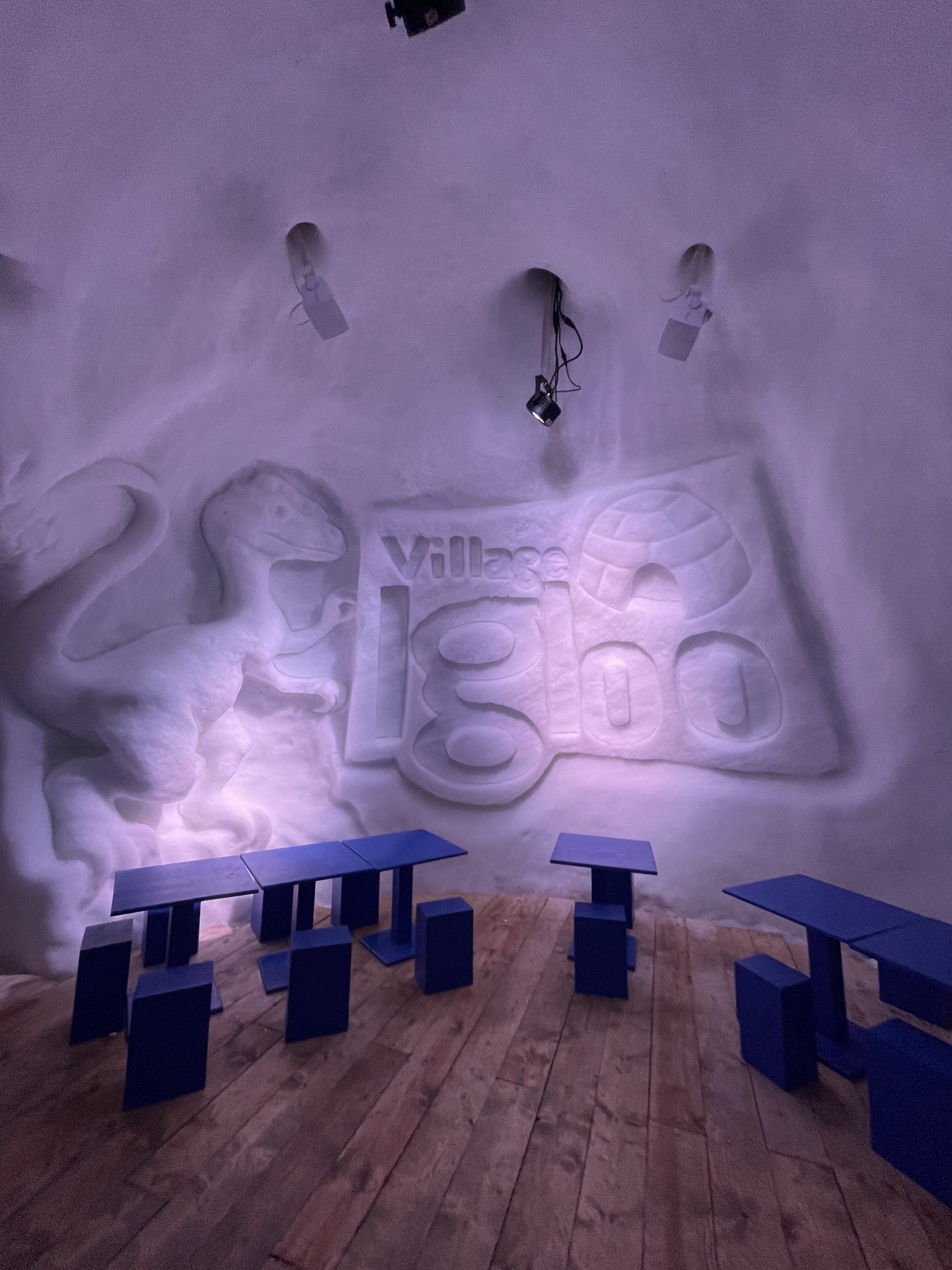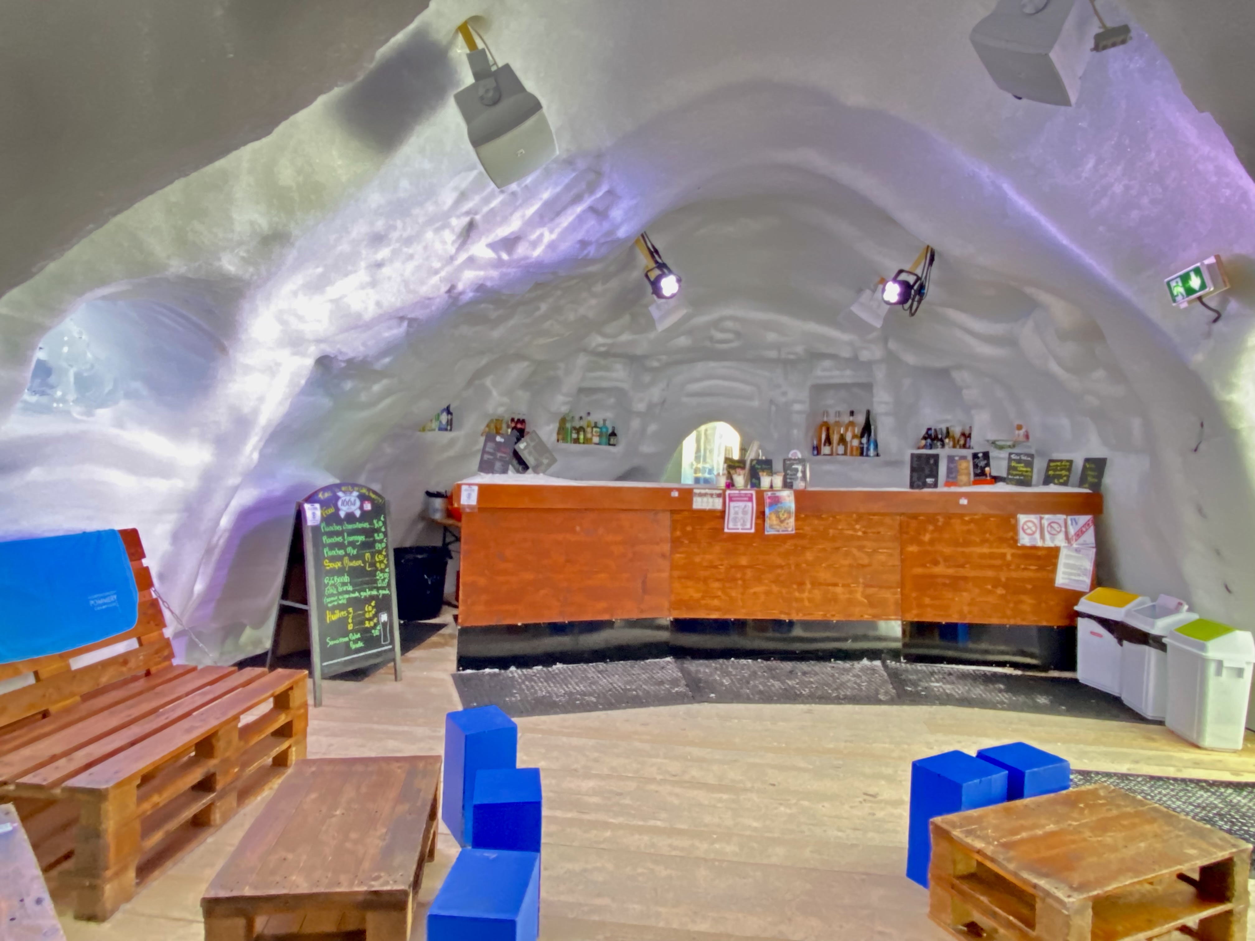 Le village igloo permet de se soulager avec des toilettes sèches et de passer un bon moment bien au sec lors d'intempéries. On y trouve de la bonne musique, des croques monsieurs, un énorme choix de boissons : des simples soft aux cocktails élaborés. L'igloo comprend différentes salles avec des sculptures sur neige de dinosaures et même la possibilité de louer une chambre tout au fond pour une nuit dans un décor atypique en dormant sous des fourrures.