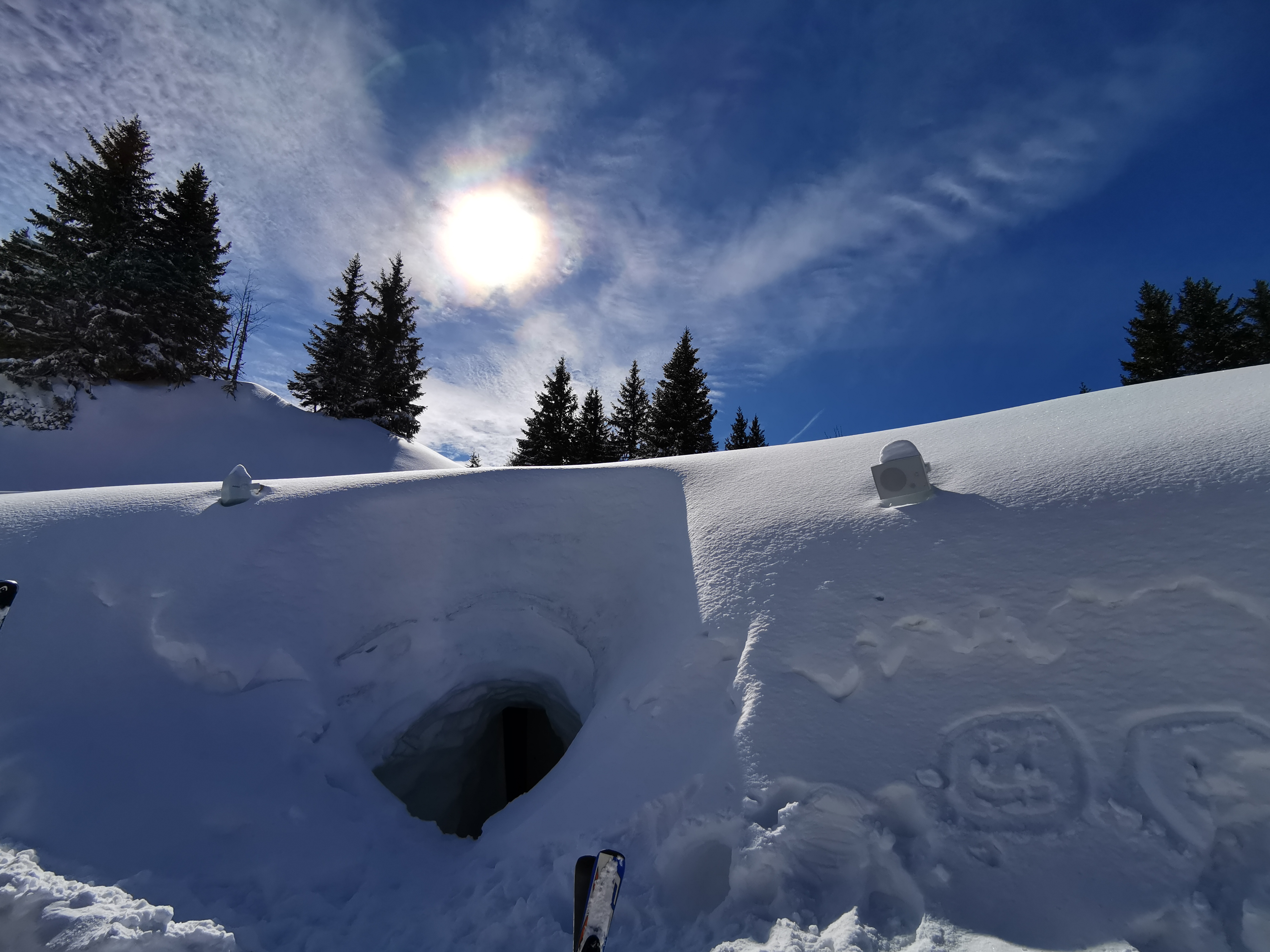 Un igloo à flanc de montagne !! Nous sommes tombés sur cet endroit par hasard alors que nous profitions de notre descente en ski et certains membres de notre groupe avaient besoin d'aller aux toilettes ! Wow quel joyau caché ! C'est un véritable igloo avec un bar, des toilettes, des sièges et même une chambre à l'intérieur ! Ça vaut vraiment le coup de s'arrêter pour prendre un verre et un magnifique bain de soleil pour profiter d'un peu de soleil tout en faisant une pause après le ski ! Très amusant