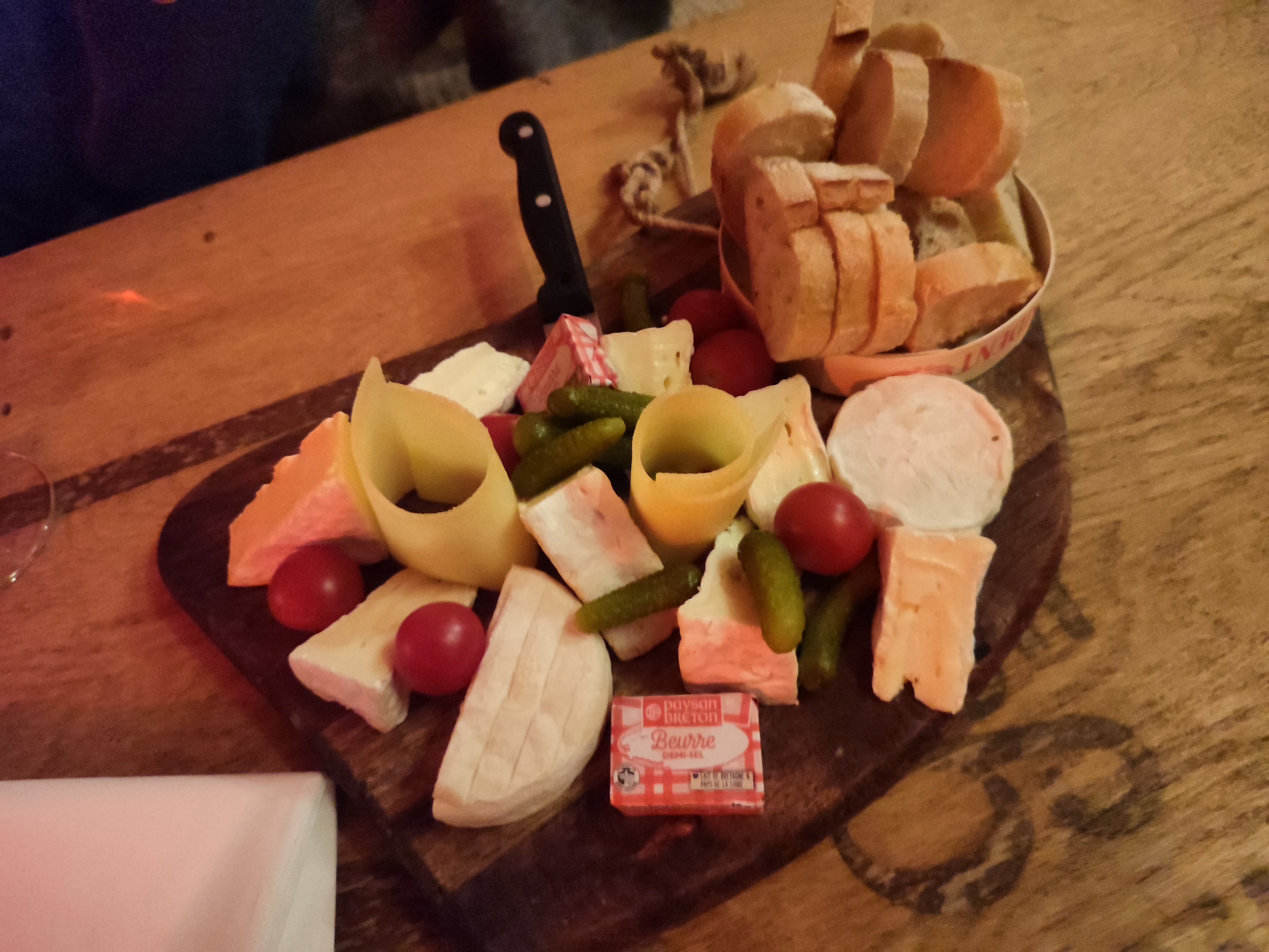 Un verre, une planche de fromage. Accueil souriant, décontracté, gentillesse. Réparties avec la fin de notre fromage, de nouveaux carrés de beurre, cornichons et petites tranches de baguettes !! 😋😍 Merci les Sales Gosses !!! 👍