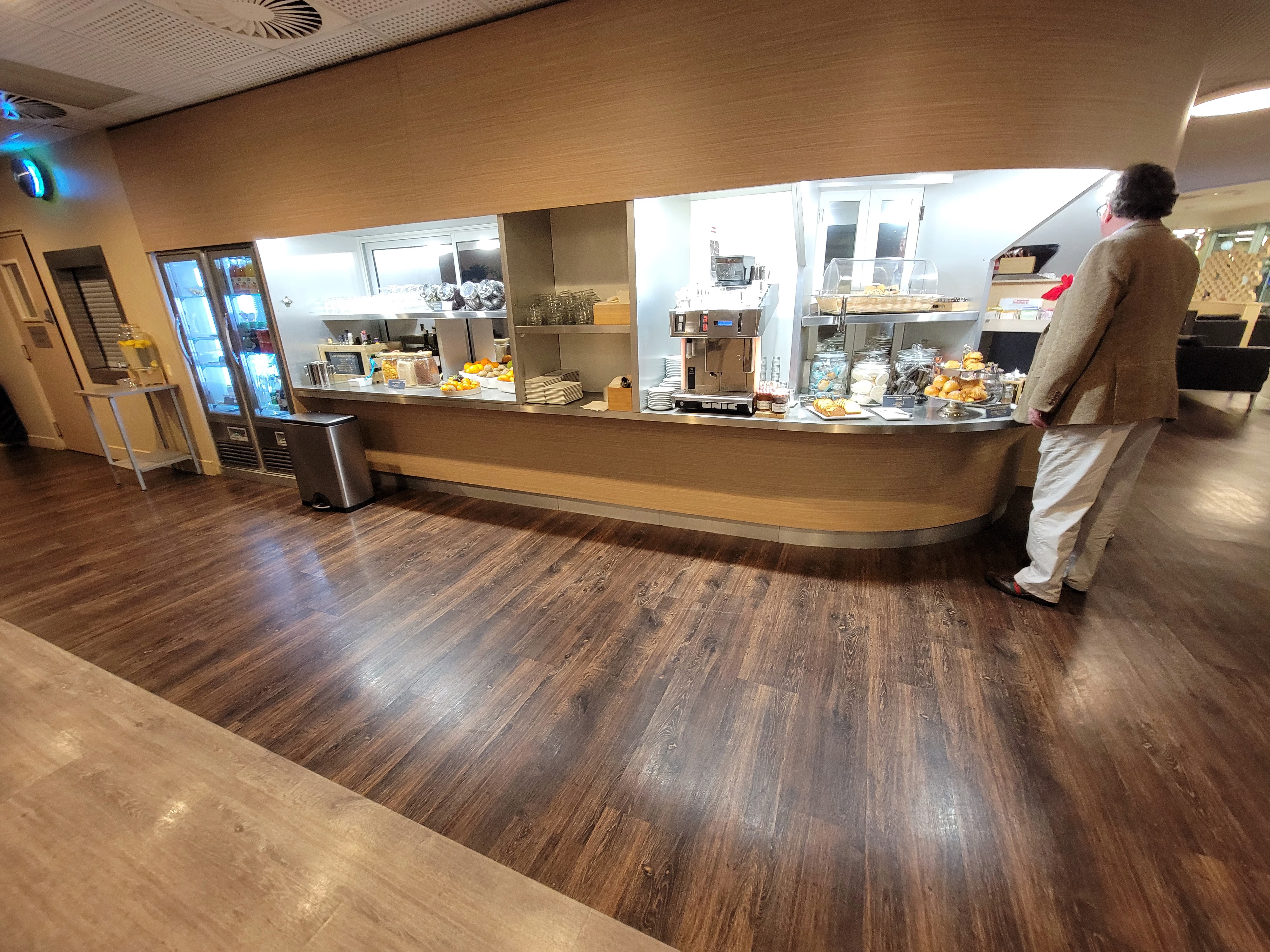 Rarement vu un lounge aussi mauvais: Arrivé en fin de matinée, aucune viennoiserie, céréales, salade de fruits et quasi pas de pain. Le « coin salé » est quant à lui exécrable: des ersatz de sandwiches au « gâteaux salés » qui ne valent pas mieux que de la pâte à pizza Domino’s. Cote boisson, il y a le strict minimum. Pour couronner le tout, tous les compromis n’offrent pas les mêmes produits, il faut donc faire son petit marché jusqu’à l’autre bout du lounge pour voir ce qu’il y a.