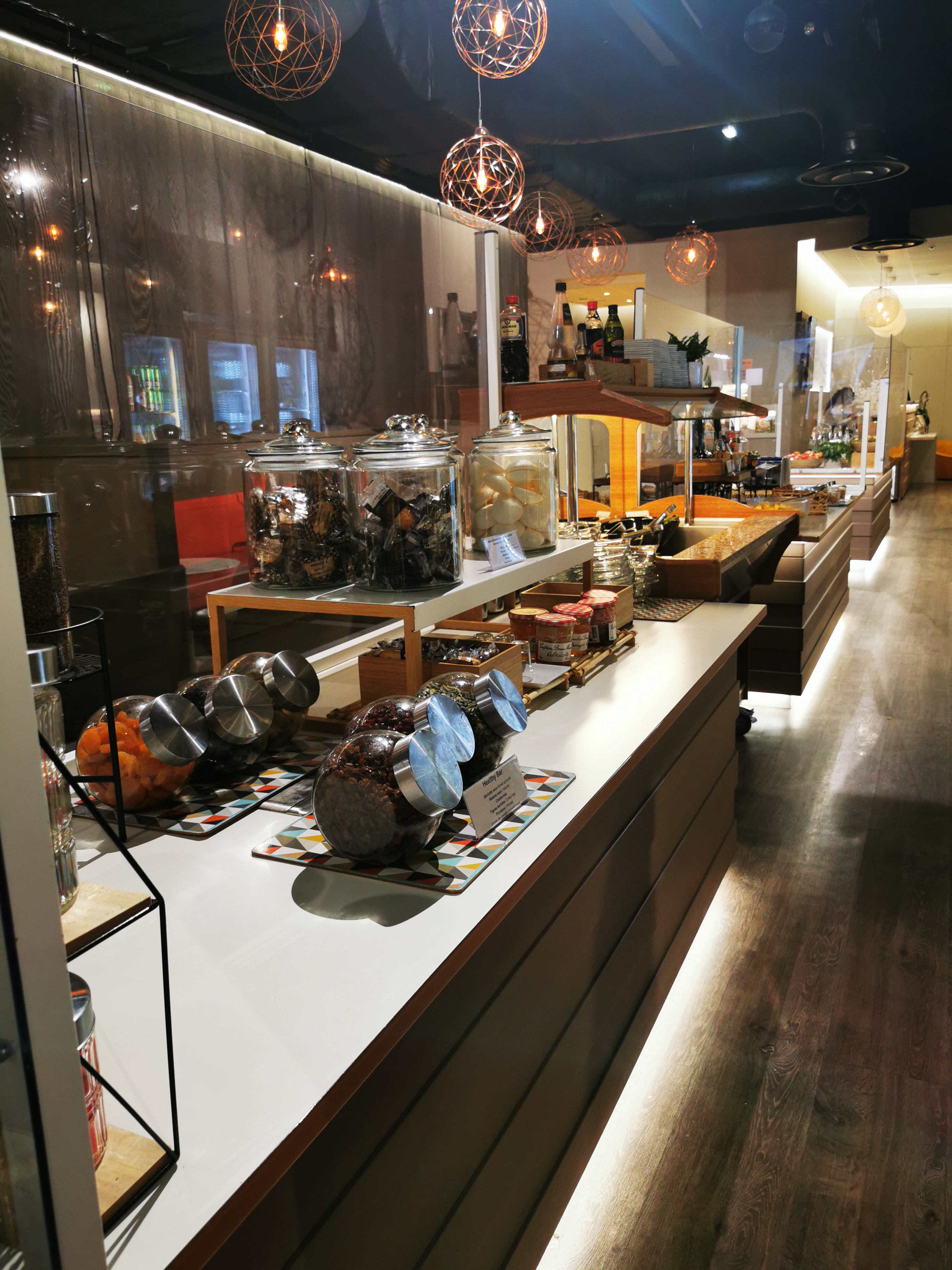 Une bonne sélection de plats froids. La plupart d'entre eux sont suffisamment copieux. Il y a une sélection de crackers et du fromage. Salade, carrés de pizza aux olives, cacahuètes, gâteaux sucrés, friandises. Fruits et yaourts. Salami et autres tranches. Sélection de boissons telles que des boissons gazeuses, des jus d'eau, de la bière et des spiritueux. Chocolat chaud, thés et café. Pain à griller, confitures, miel. Ordinateurs pour utiliser Internet. Une zone tranquille de chaise longue. Beaucoup de tables et de chaises. Prises USB et prises électriques.