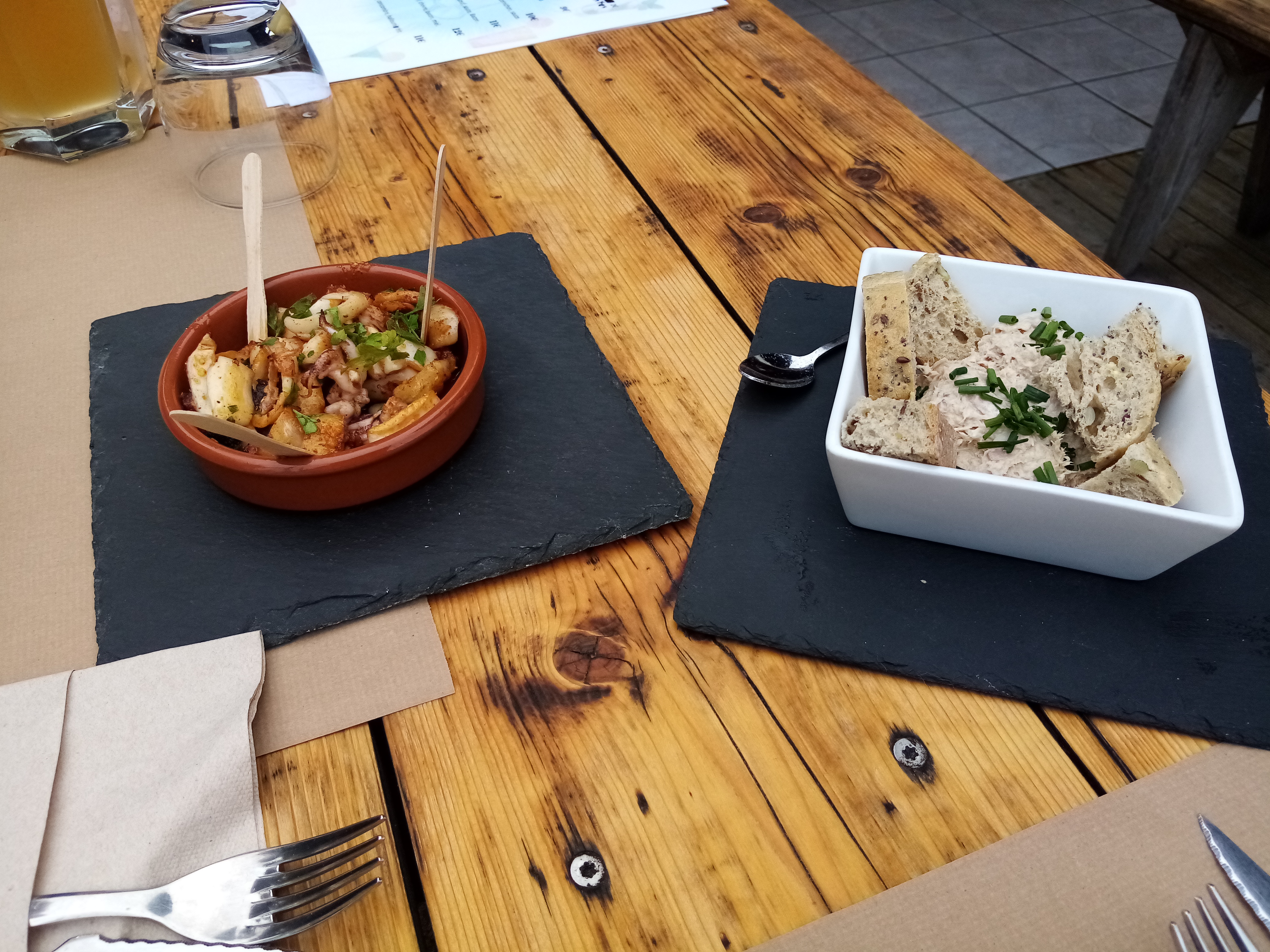 Accueil un peu timide au départ, tapas (strick de fromage et calamar a la romaine = delicieux et cuisson parfaite), mojitos, sangria et burger très bien servi et très bon 😋