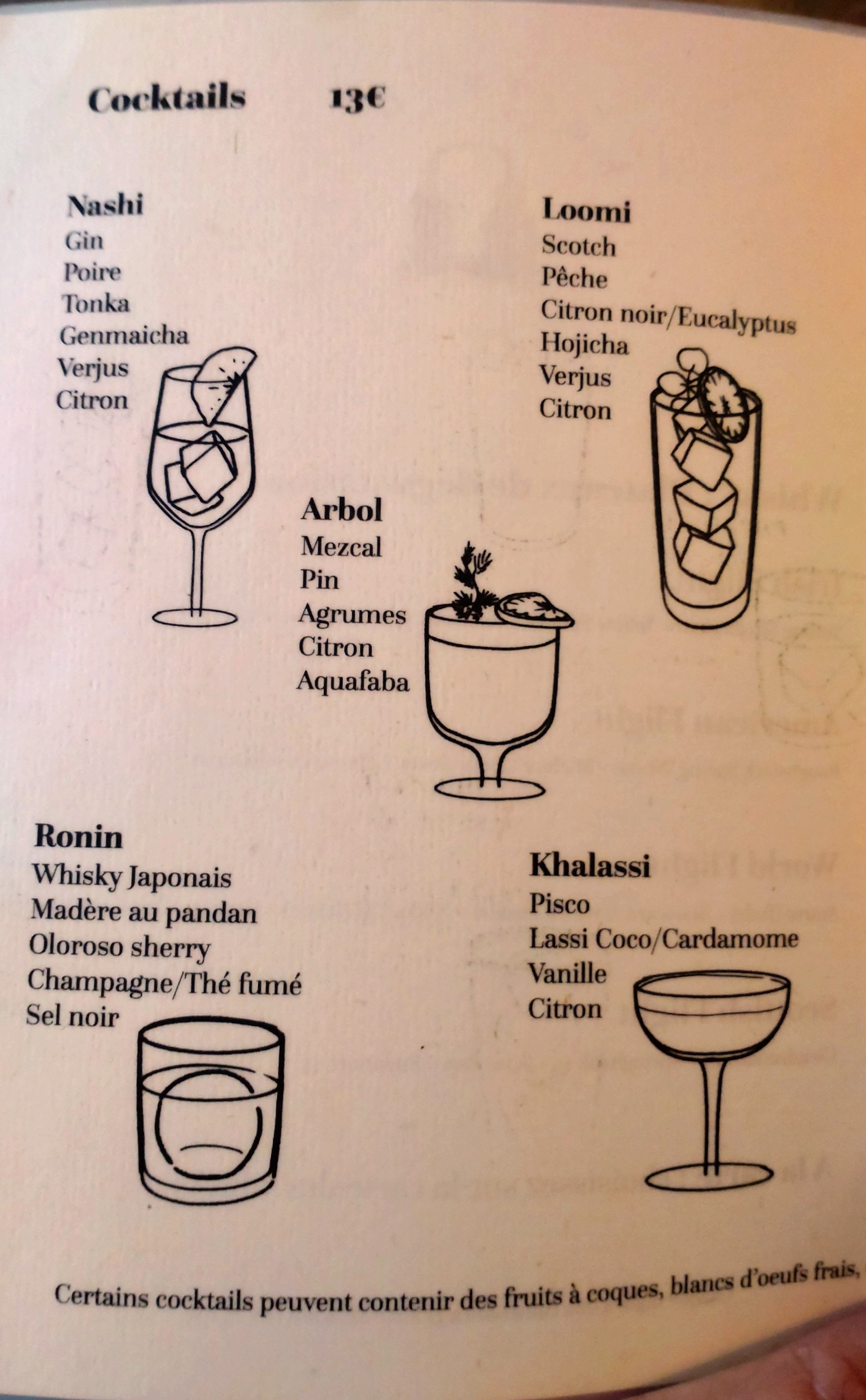 Les deux cocktails testés (Arbol et Khalassi) sont délicieux. L’expérience est réussie avec la découverte de nouvelles saveurs et des goûts qui restent en bouche. Edit: Deuxième visite pour goûter les cocktails Loomi & Nashi. Très bons également.