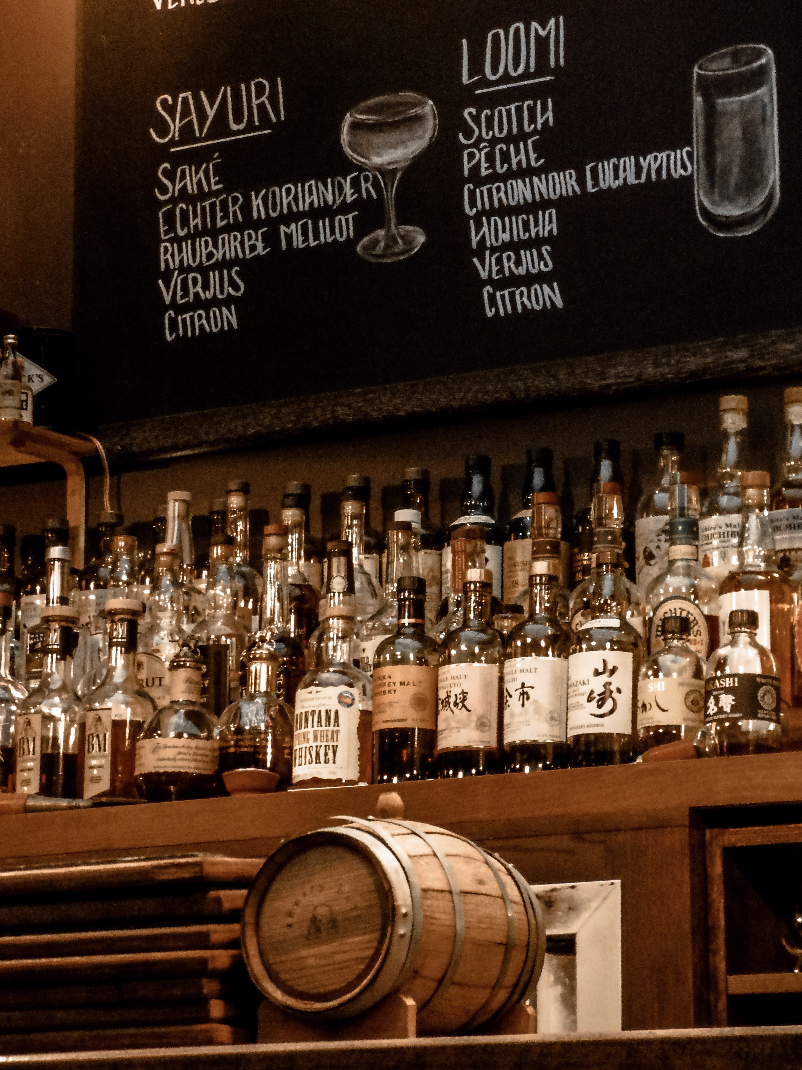 J'hésite à laisser un avis positif, tellement j'ai envie de garder cette adresse secrète. En une soirée, c'est devenu mon bar à cocktail préféré. On entre, l'endroit est petit et cosy, la musique est très chouette – je remarque plus tard qu'il y a un DJ. Le serveur est attentionné, à peine arrivé il nous apporte la carte avec un verre d'eau. Il y un choix suffisamment large de whiskies, un notamment une très belle sélection de whiskies japonais. Les barmen sont jeunes, beaux gosses, hyper gentils, et savent ce qu'ils font. Assis au comptoir, j'ai adoré voir notre barman tailler un cube de glace pour le old fashion. C'est un vrai spectacle.