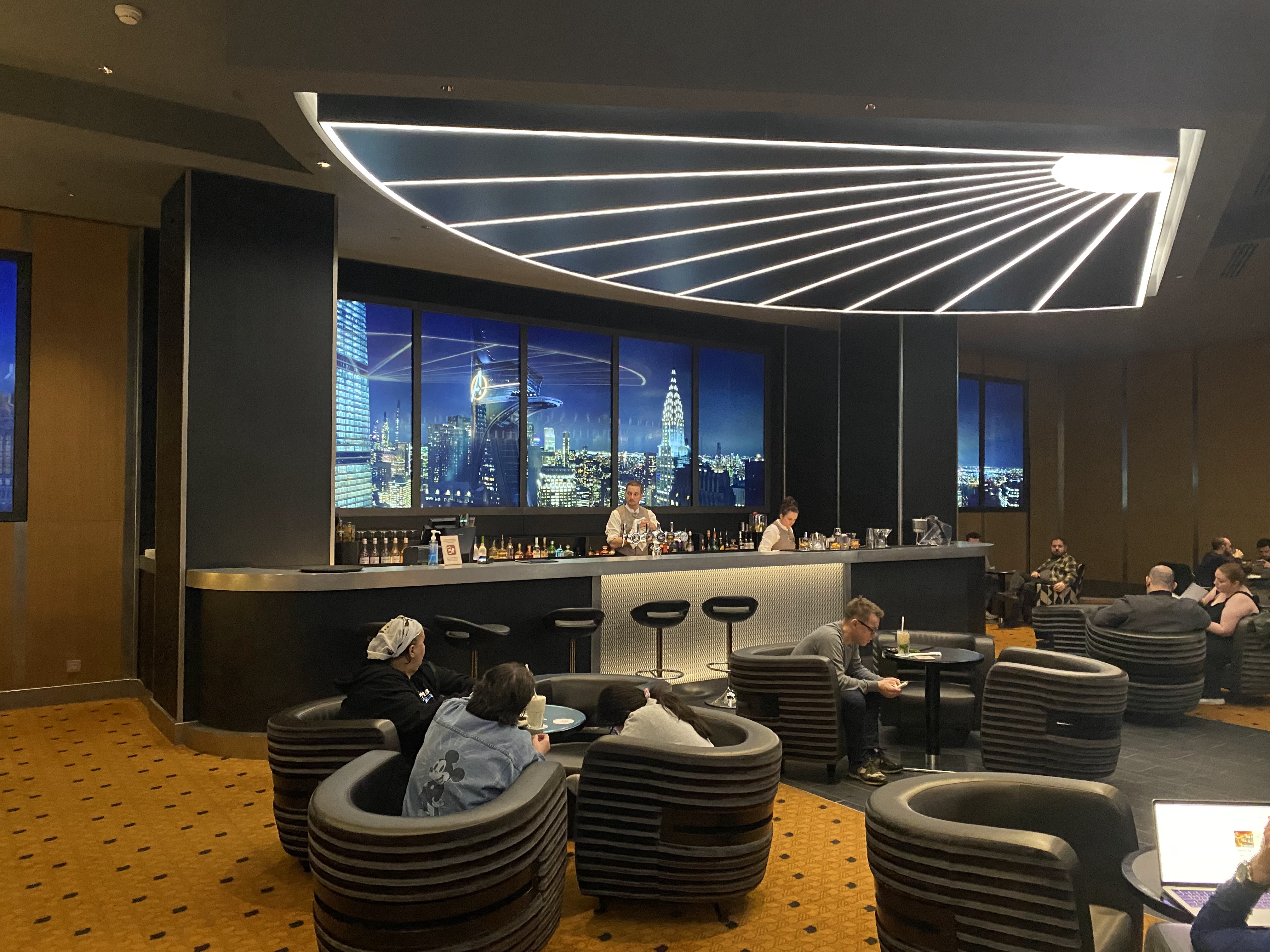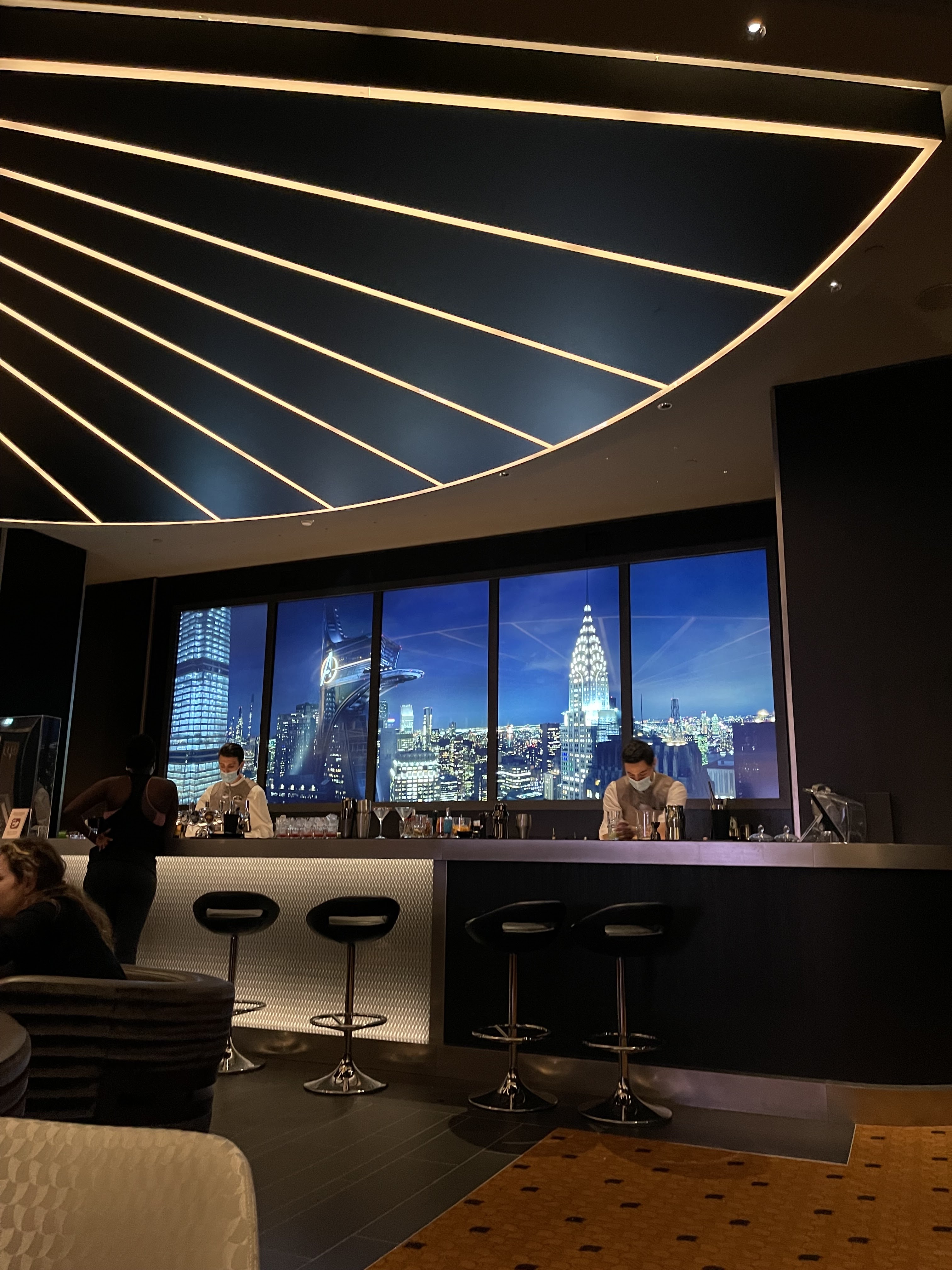 Le choix pourrait être plus large en matière de cocktails (que ce soit avec ou sans alcool). J'en ai pris un sans alcool et c'était très bon... même s'il faut dire que les prix sont relativement élevés. Mais ça vaut le coup d'y aller une fois tous les trois jours... Mais l'ambiance est agréable et le bar est vraiment joliment conçu. À certains moments, vous pouvez également voir comment le « skyline de New York » change du jour à la nuit... et de temps en temps, même Spiderman passe !