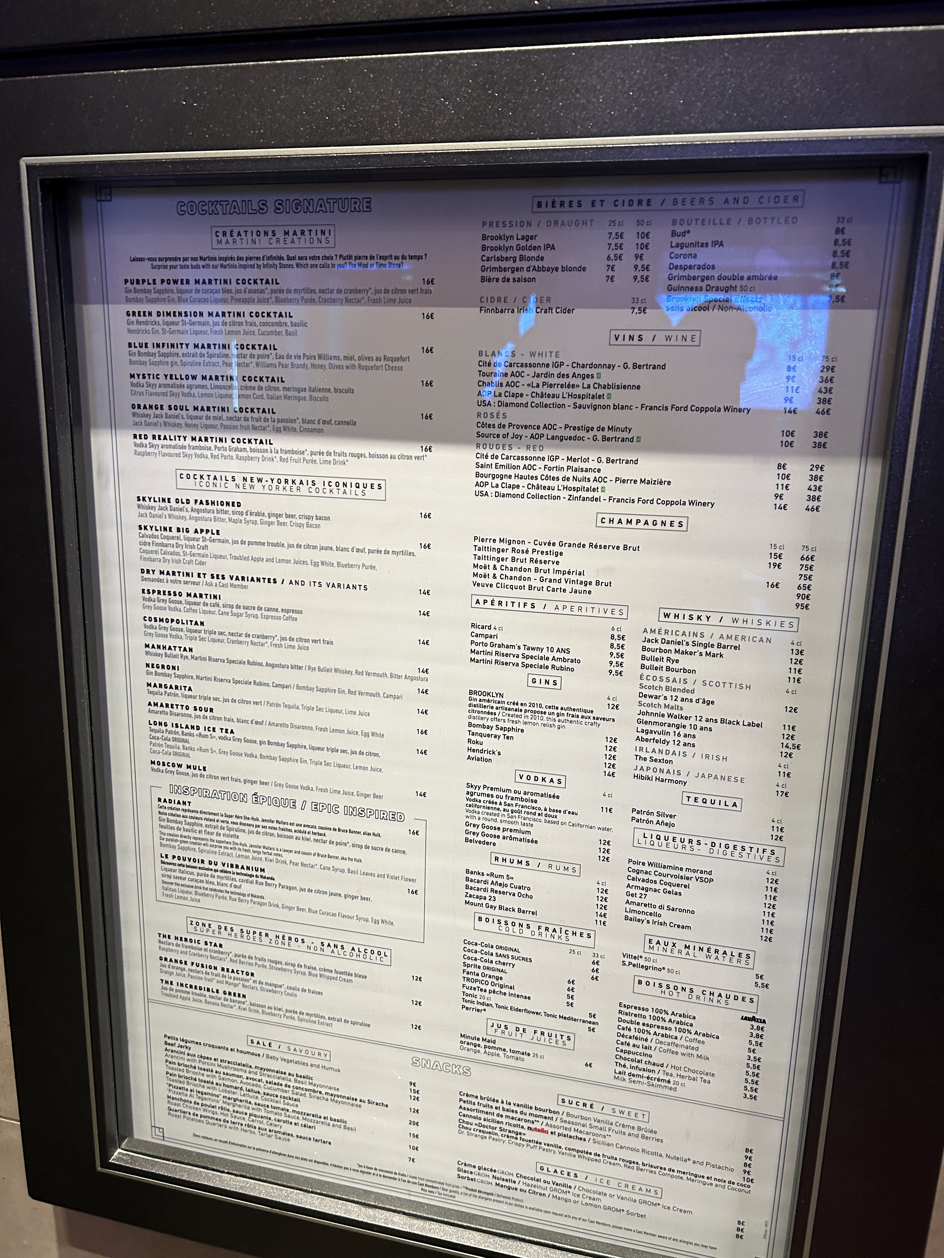 Prix Disney mais cocktails très bons et originaux et les serveurs sont adorables et pros.