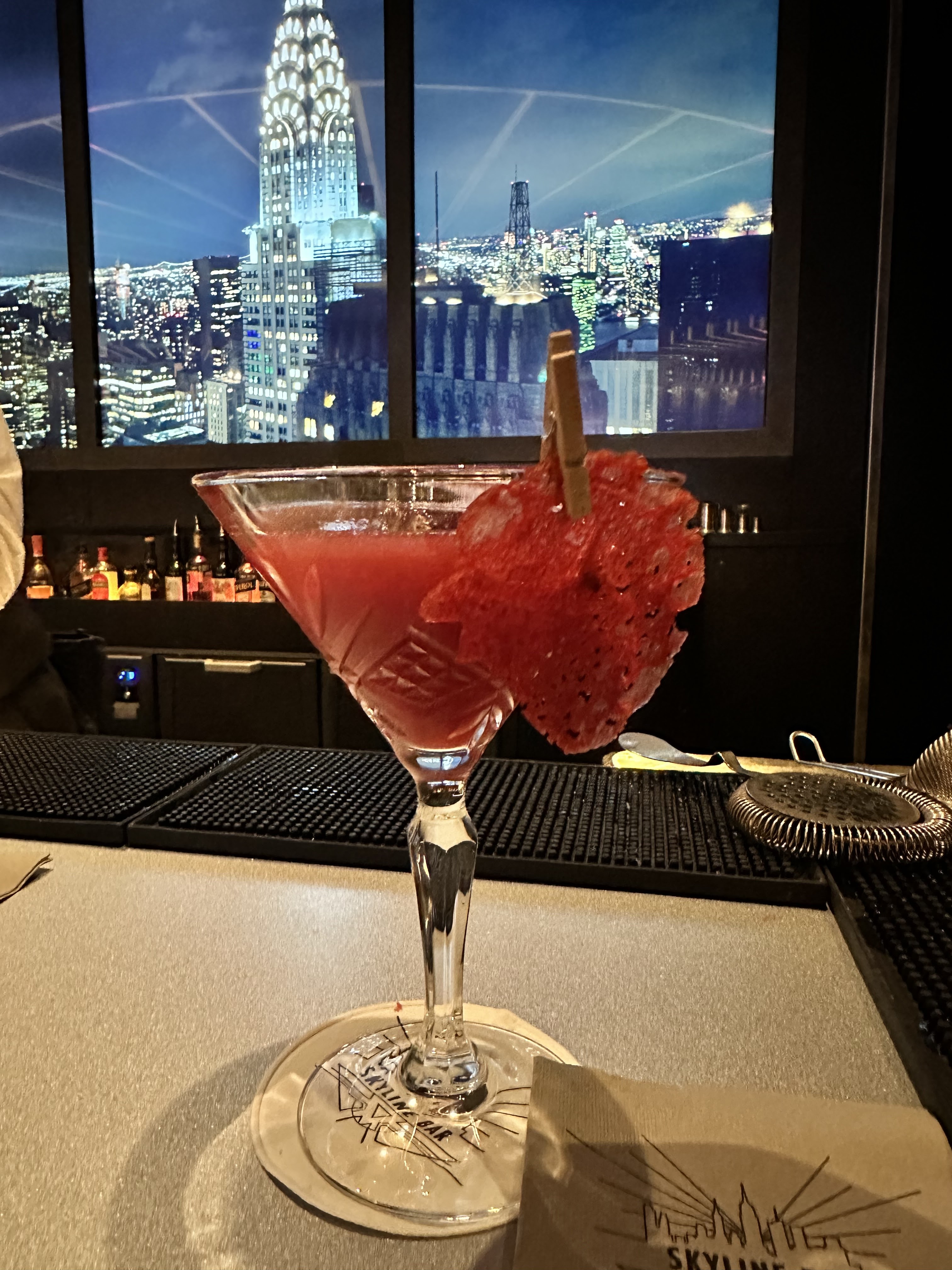 Superbe ambiance au Skyline bar, on a l'impression d'être au dernier étage d'un building à New York avec leur écran d'animations. Leurs cocktails sont très sympas visuellement, j'en ai pris qui était un peu trop sucré mais intéressant en saveurs. Ils ont une gamme de cocktails Martinis plutôt classe ! Et les cocktails sont très bien réalisé.