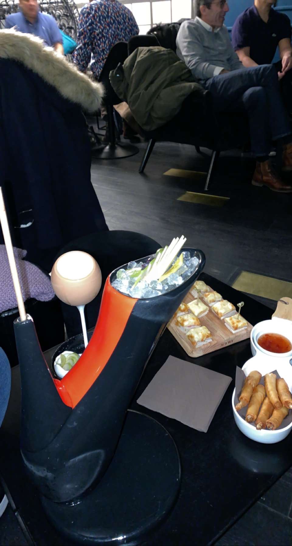 Très bonne soirée passée ici ! Les verres à cocktails sont en effet toute une expérience ! A faire au moins 1 fois. Les cocktails en eux-même sont bons et bien élaborés et les serveurs savent de quoi ils parlent. Ils sont d'ailleurs tous très sympathiques. J'avais réservé et cela s'est bien passé. Les prix sont ce qu'ils sont pour un bar parisien original rien d'étonnant selon moi. L'ambiance était assez festive, j'étais assez étonné de la musique assez forte mais ça m'aimait très bien d'autant plus que la playlist était assez originale avec des chansons des années 2000 souvent.