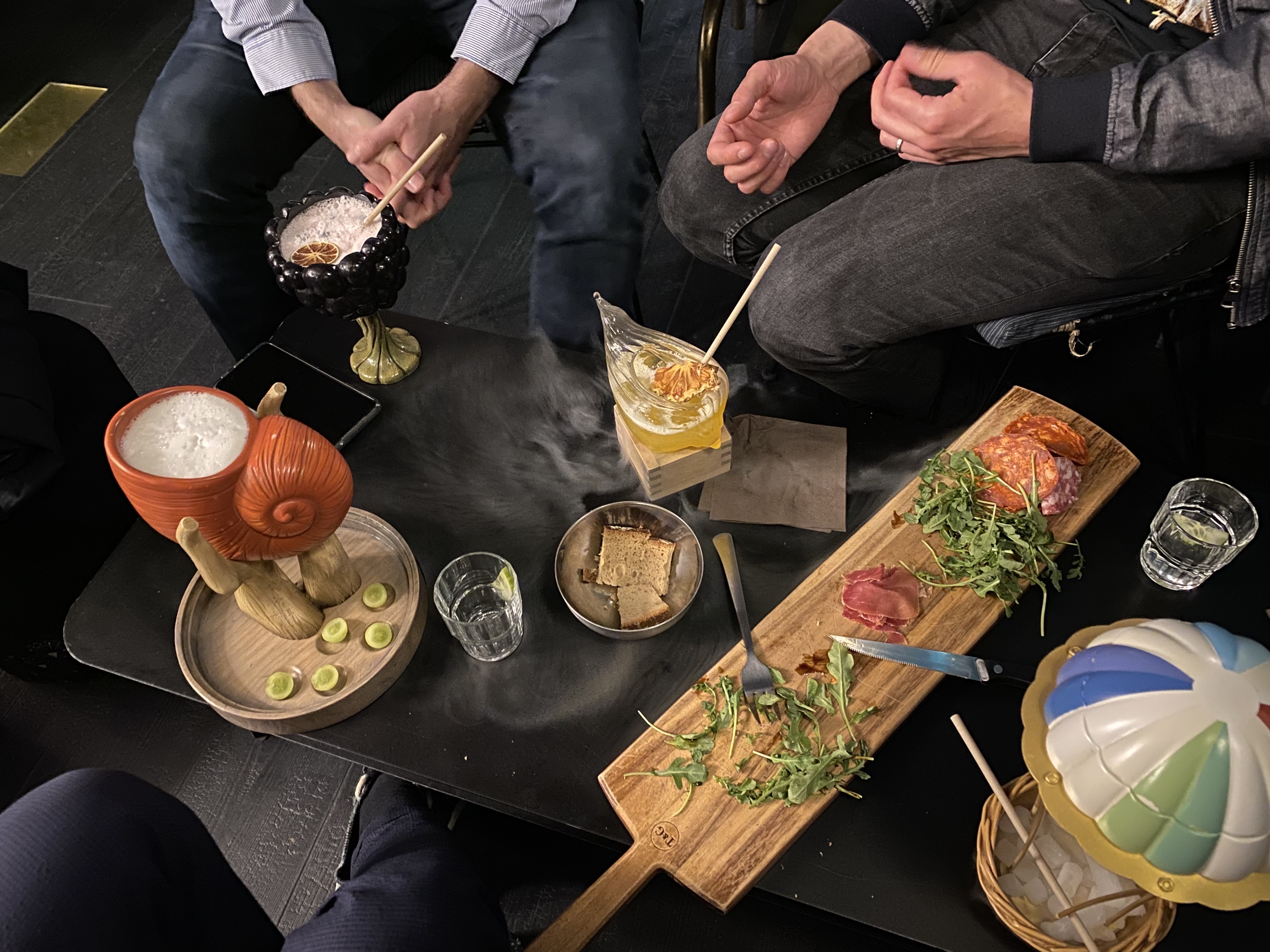 Cocktails très originaux et surprenants ! Le bar vaut le détour effectivement. Par contre, il est exiguë et donc assez bruyant, nous avions du mal à nous entendre. Les planches sont vraiment décevantes par contre... Quelques tranches de charcuterie seulement et une rondelle par fromage, vraiment léger pour le prix ! On a donc opté pour 3 burgers et 1 hot dog en plus : nous avons attendu 40mn avant d'être servies et le hot dog est arrivé 20mn après les burgers... Je ne pense pas y retourner malheureusement mais c'est à faire au moins une fois je pense.