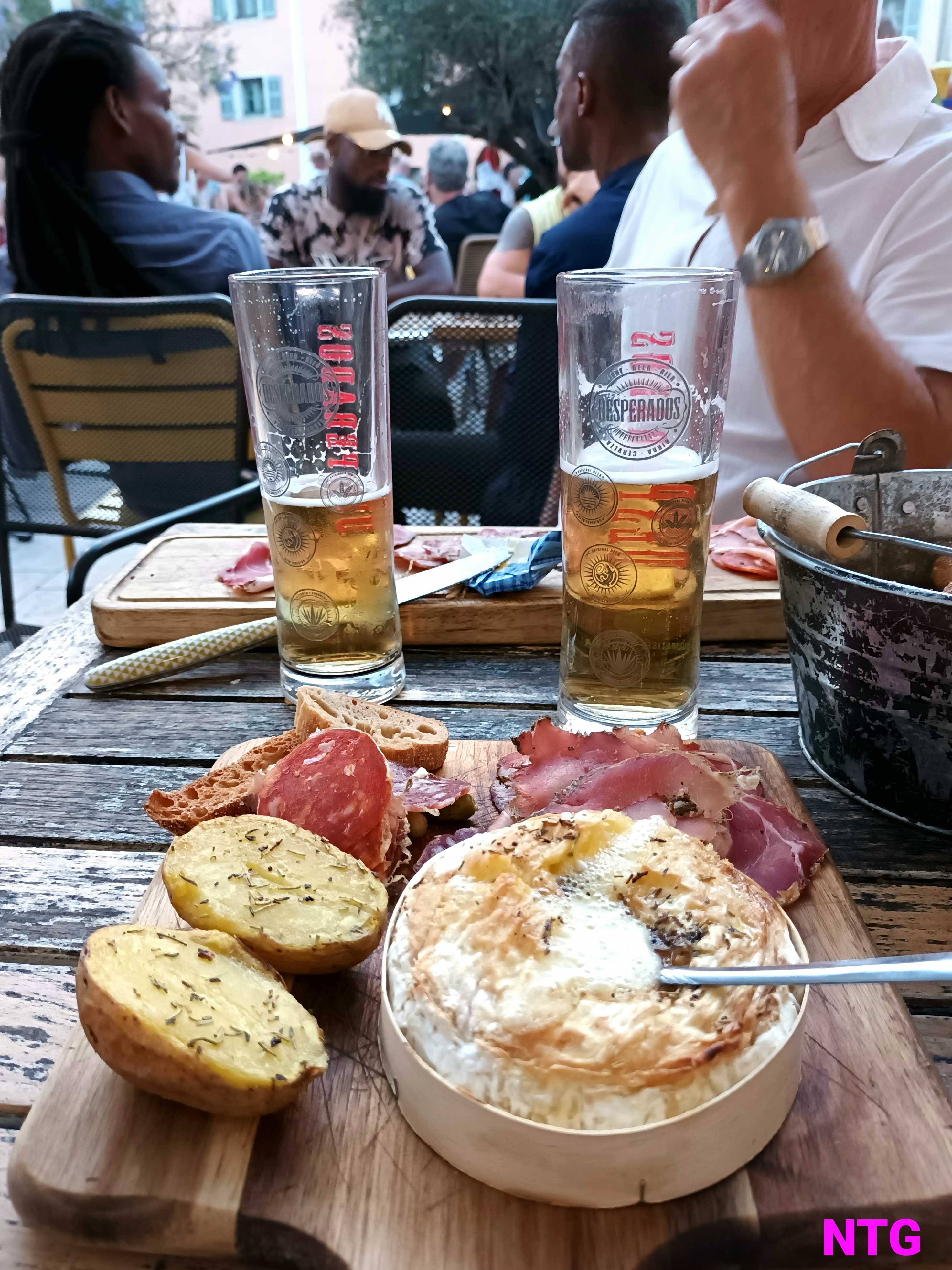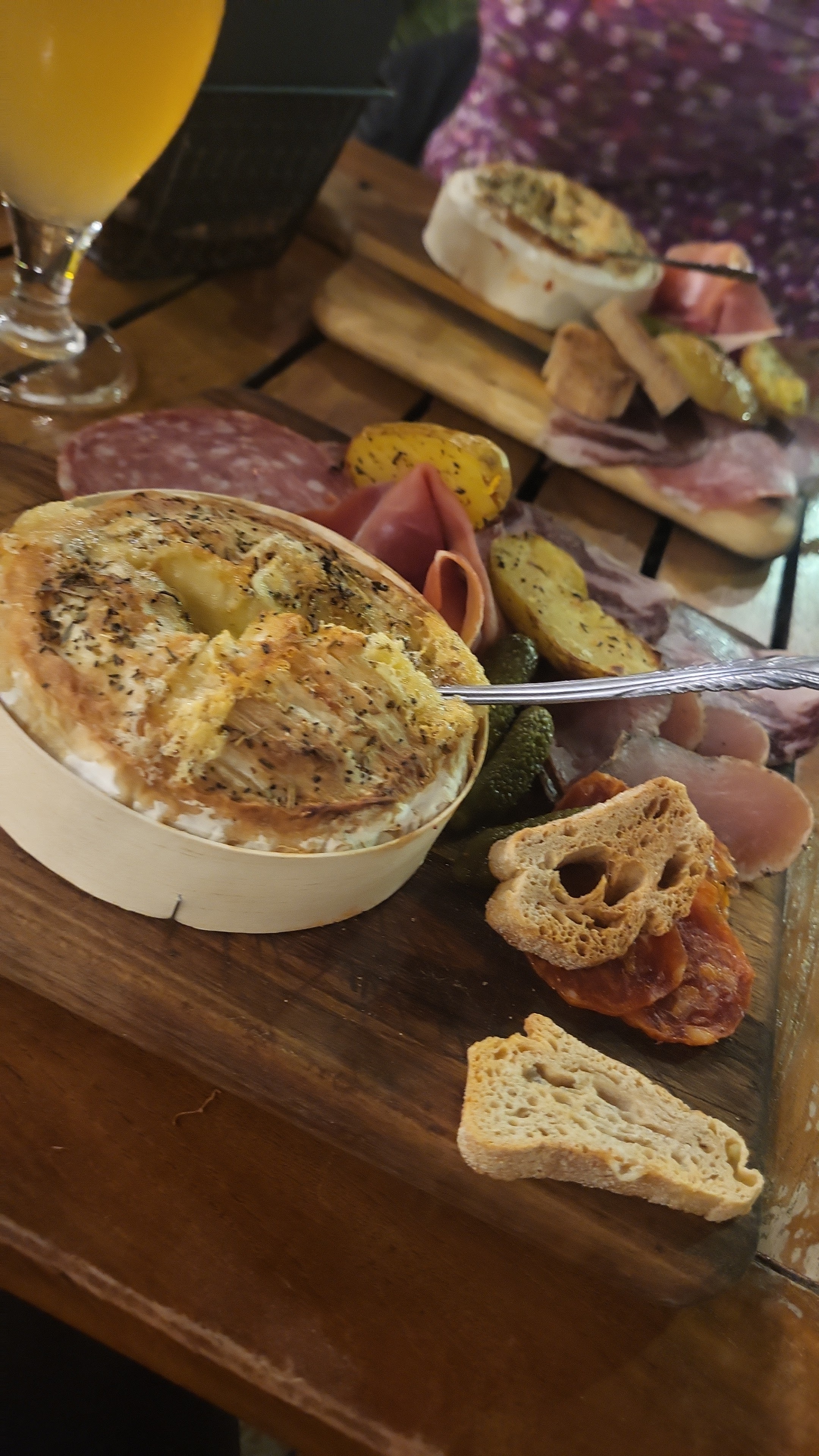 Bières à la pression, plancha de charcuteries et fromages et camembert au four accompagné de charcuterie et patate. Bonne qualité. Serveuses aimables et service rapide alors qu'il y avait du monde pour la soirée latina de la Caravane de la Salsa place de l'Equerre