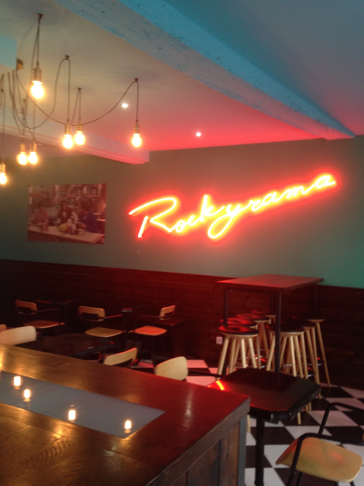 ❝ Ampoules nues et sol en damier dans ce café/diner US avec sport, musique live et programmation de films. ❞