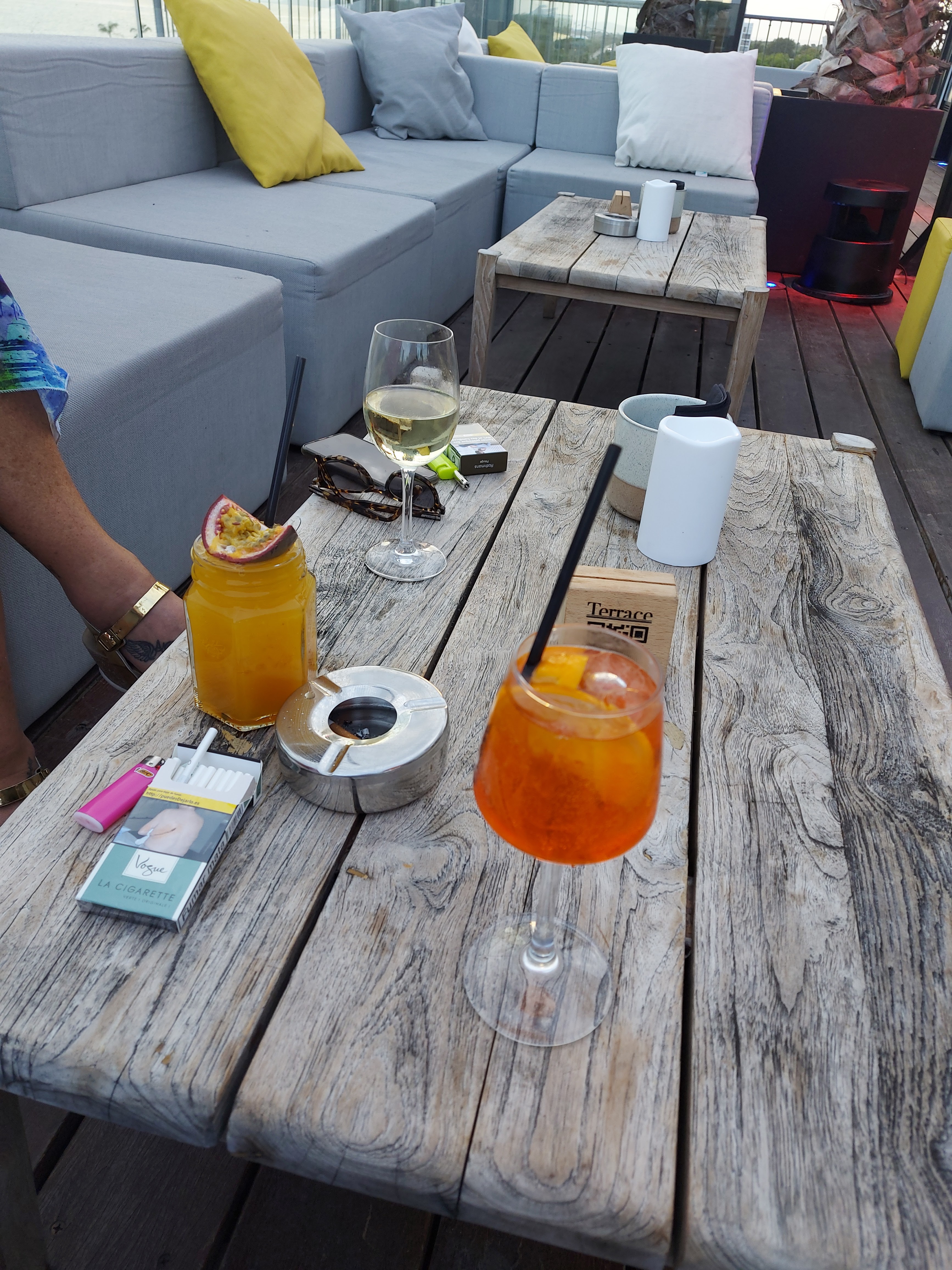 Nous devions y rester dîner mais en voyant la carte (tapas, pizzas..) le restaurant juste en dessous nous a plus attiré.. Nous avons donc simplement pris un cocktail, très bon, vue imprenable sur la Méditerranée et sur le coucher de soleil. La terrazza est idéale pour l’apéro ou l’after ! Ambiance musicale lounge très agréable.
