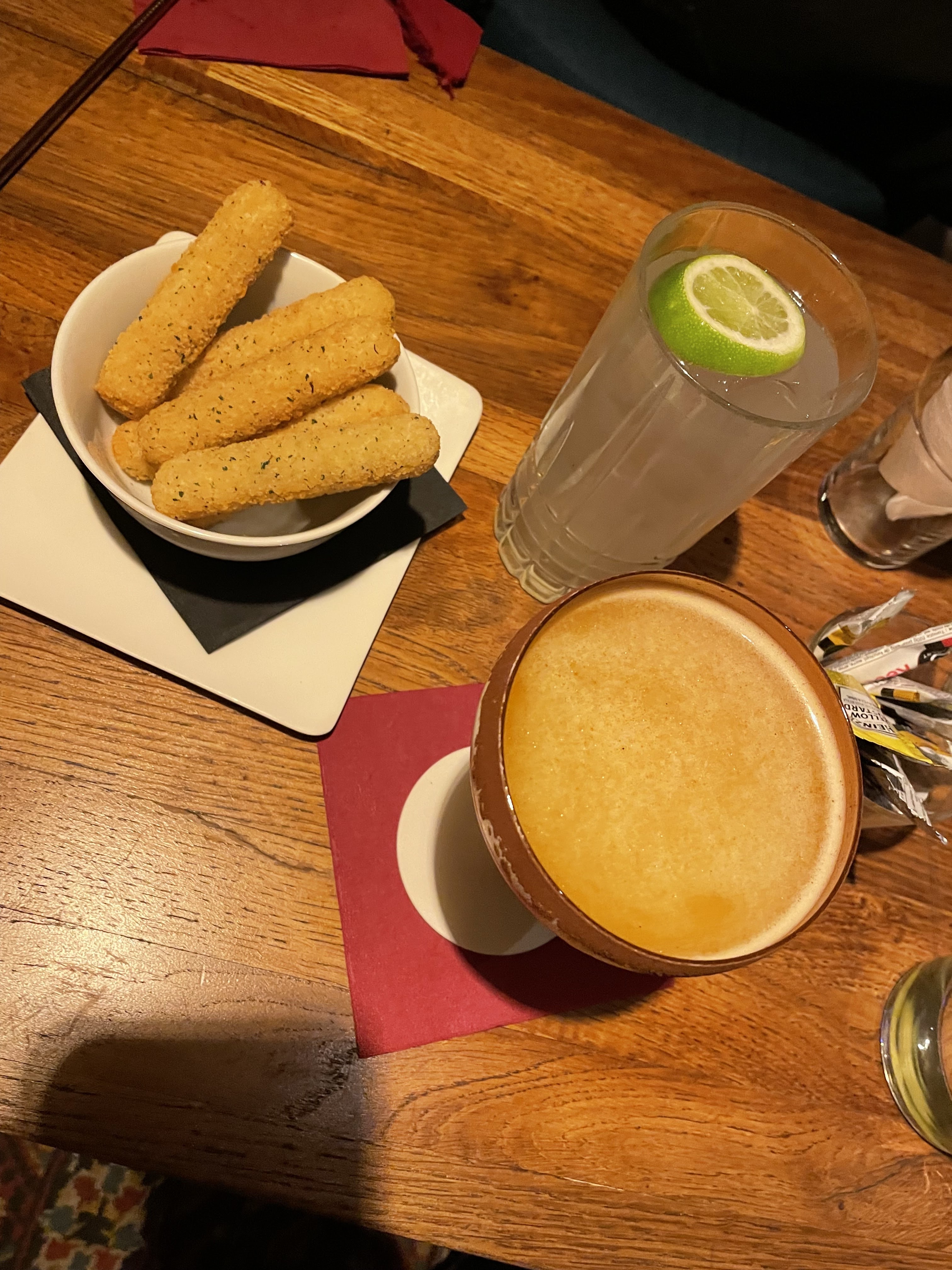 Lieu soigné dans les détails, très belle mise en place. Il propose des cocktails qui semblent raffinés mais l'exécution laisse à désirer. Le mien était sans alcool même si ce n'était pas ce que j'avais demandé. Bâton de mozzarella….aucun commentaire 😅 dommage car le personnel est très gentil et l'emplacement du lieu est parfait