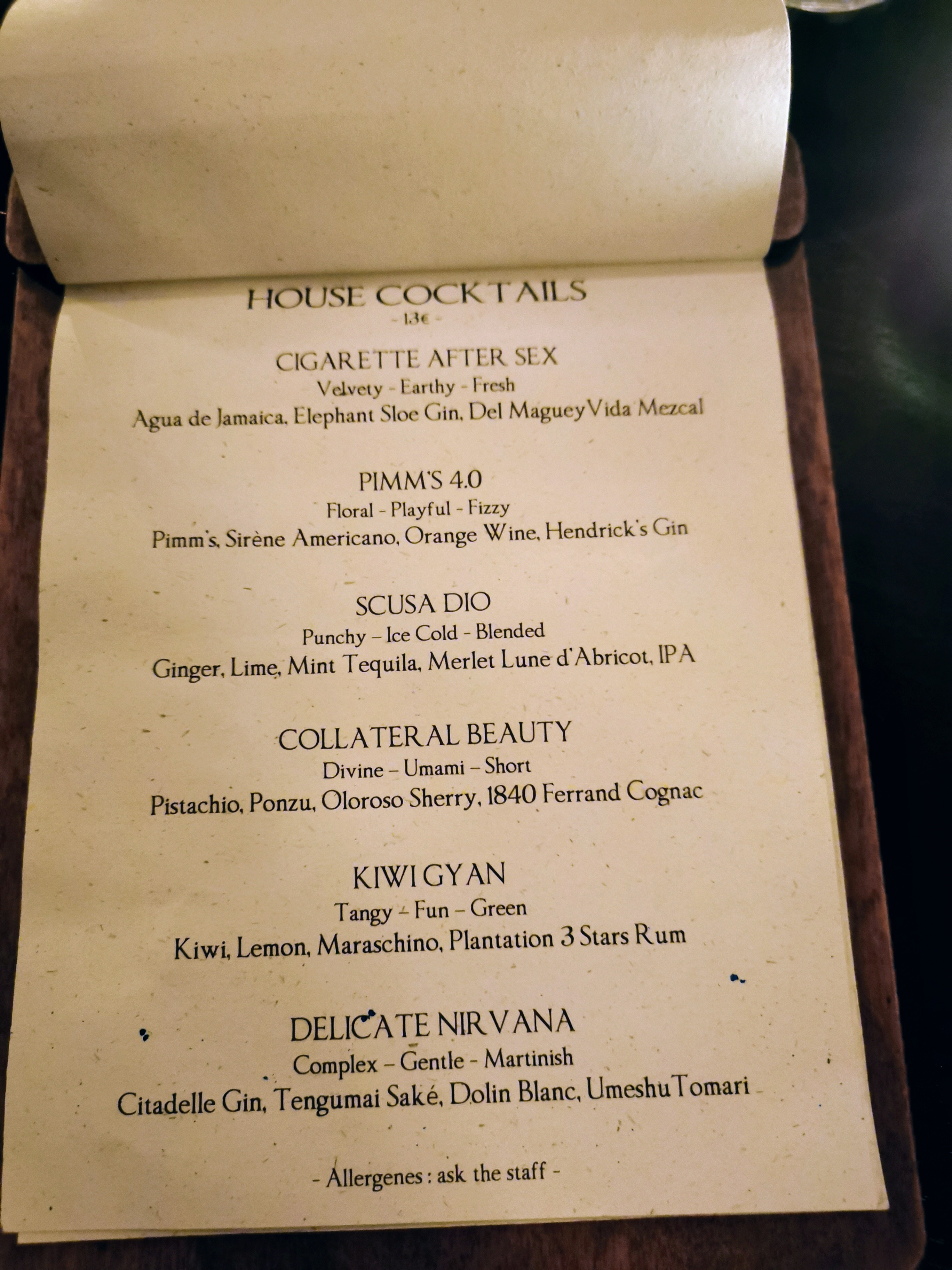Magnifique carte des cocktails réalisées avec soins ! Très belle expérience